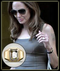 טבעת האירוסין של אנג'לינה ג'ולי בראד פיט הציע לאנג'לינה ג'ולי נישואים עם טבעת הנאמדת בשווי של 500,000$, מדובר ביהלום נדיר, מרובע, בחיתוך ייחודי שנקרא "אמרלד קאט" מעין טבעת חותם עם יהלום ענק ומרגש. היהלום הינו 7 קראט והוא מוקף יהלומים בשווי 9 קראט. |