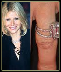 טבעת האירוסין של גווינת פלטרו על פי השמועות קיבלה השחקנית המפורסמת את הצעת הנישואים בטלפון מה שלא מנע מבן זוגה כריס מרטין סולן הלהקה המצליחה "קולדפליי" גם לפנק אותה לאחר מכן בטבעת. הטבעת משובצת ביהלום מרכזי בצורת אשר (Asscher) ומסביב לו ישנם יהלומים קטנים בשיבוץ פאווה. היהלומים הקטנים משובצים גם סביב חישוק הטבעת עצמה. |