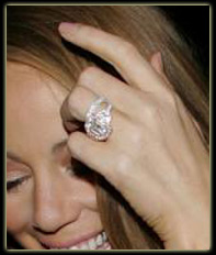 טבעת האירוסין של מאריה קרי טבעת הצעת הנישואים של הזמרת המפורסמת הגיע בשנת בעטיפת סוכריה, כשפתחה קרי את העטיפה גילתה להפתעתה טבעת יהלום בשווי של 2.5 מליון דולר, הטבעת מורכבת מיהלום מרכזי השוקל 17 קראט והוא בצורת אמרלד וצבעו ורוד שהודגש משני צדדיו ביהלומים בצורת חצי ירח. התכשיט המיוחד עוצב ע"י ג'ייקוב ארבו היהלומן מניו יורק. |