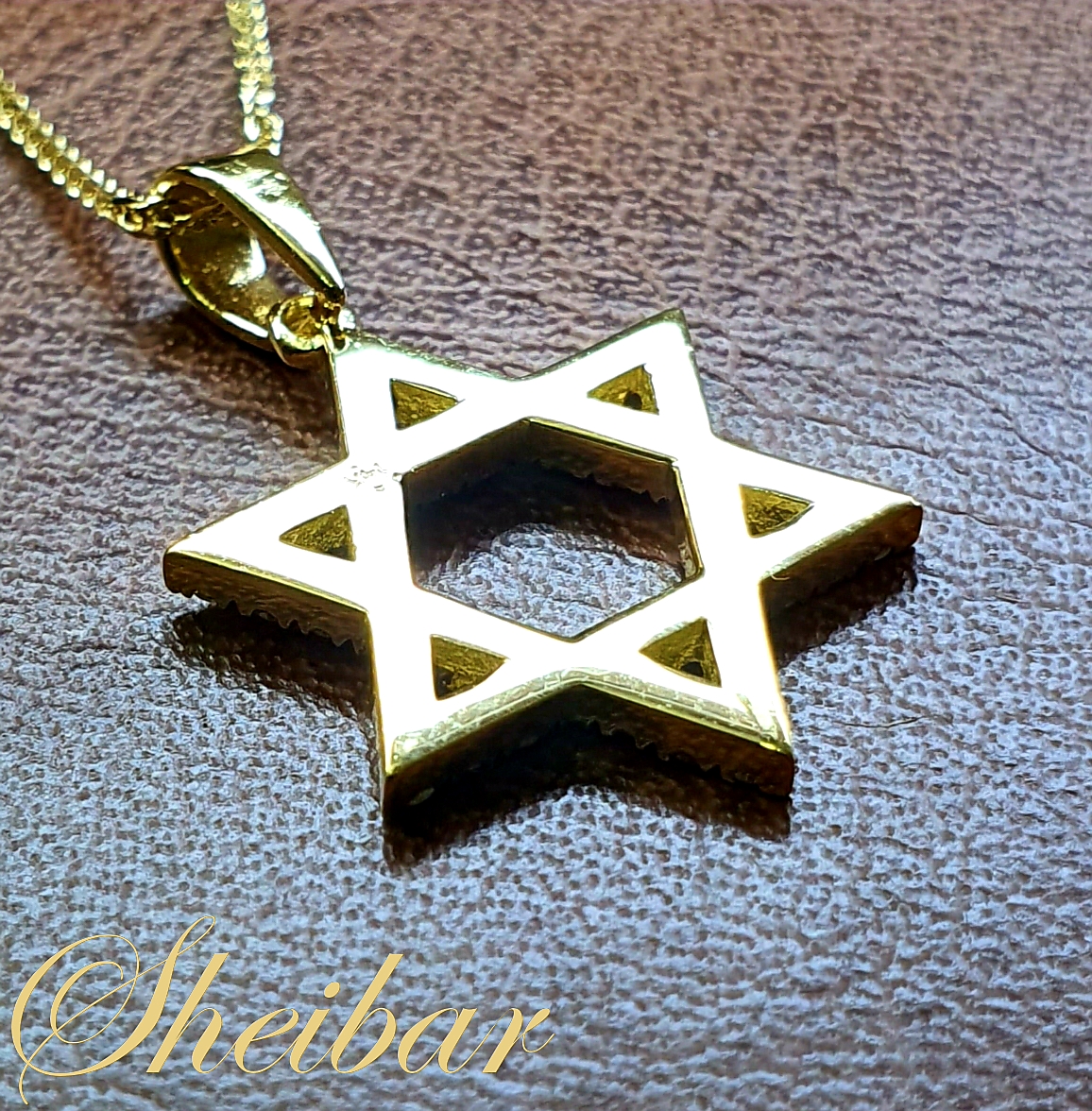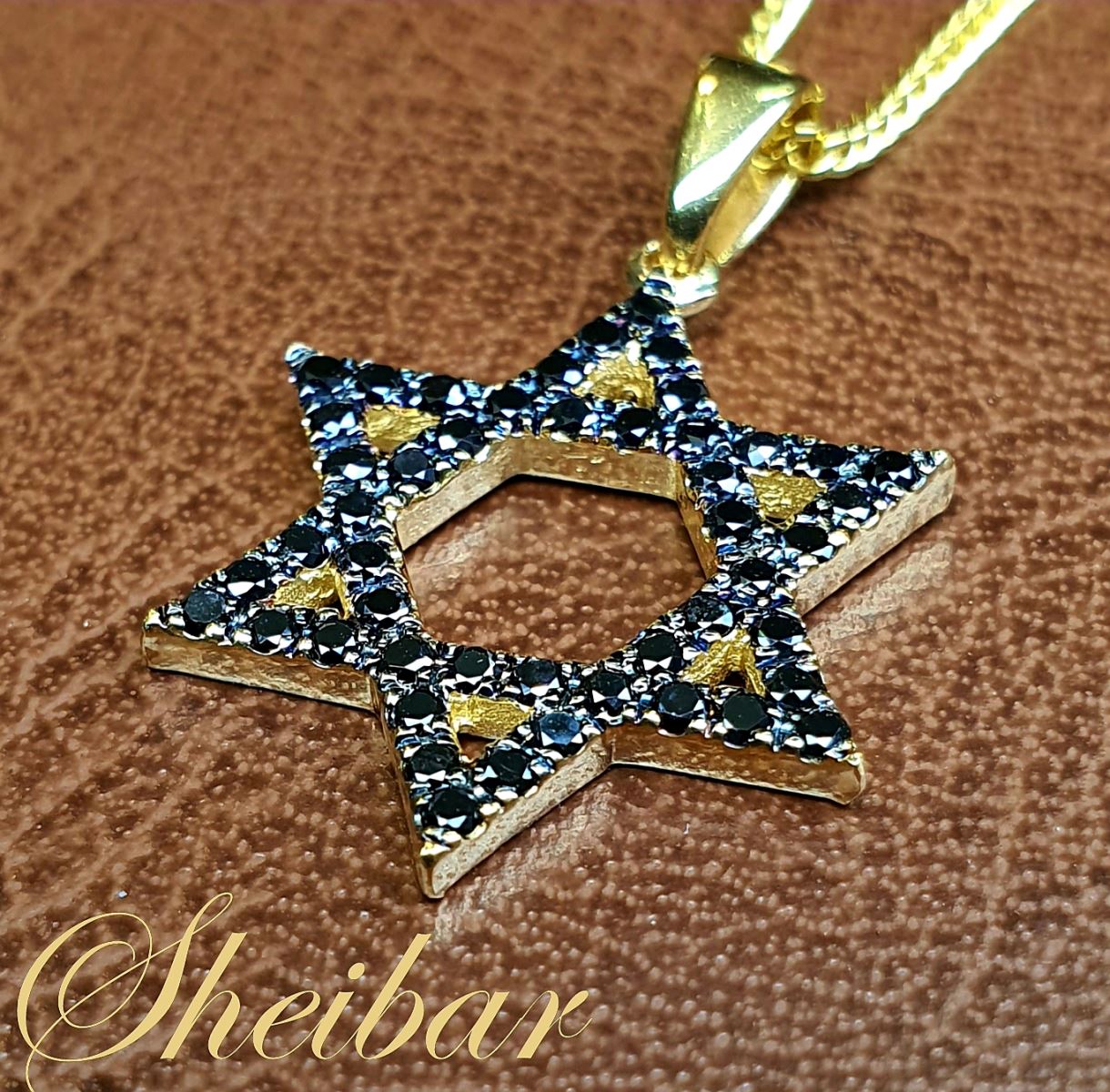 תליון "מגן דוד", משובץ כולו יהלומים איכותיים בשיבוץ סימטרי ויישר. שיבוץ היהלומים הוא שיבוץ שיניים, אשר נעשה בצורה צפופה ביותר. שיבוץ זה מבליט כל יהלום בצורה ייחודית משלו, ובנוסף נותן דגש לכל יהלום. הדבר היפה והשונה בתכשיט זה הוא היהלומים השחורים. הצבע השחור של היהלומים עם שילוב הצבע של הזהב נותן דגש יפה ומרשים ליהלומים והן גם לתכשיט. תליון קלסי ועדין. ניתן להוסיף יהלומים בנוסף על המתלה של התכשיט, שיוסיף עוד ייחודיות. (מידותיו של התכשיט לרוחב כ 1.2 ס"מ ולאורך כ 1.4 ס"מ)