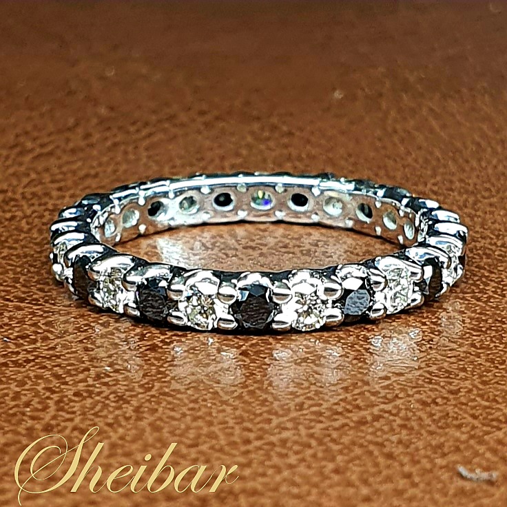 טבעת יהלומים "גלגל איטרניטי’ יהלומים לבנים ושחורים, טבעת בשיבוץ מלא המשלב יהלומים לבנים ושחורים. טבעת מרשימה ויוקרתית זו דורשת עבודת דייקנות ברמה הגבוהה ביותר. לכן מודל הטבעת נעשה בעבודת לייזר ברמה גבוהה על מנת לשמור על רמת עבודה ואיכות מהגבוהות שיש. הלייזר נעשה אחד אחד על גבי כל אחד מהשיניים של היהלומים ובכך יוצר גלגל שיניים נוצץ ומרשים מזהב חלק ומבריק. על גבי הטבעת משובצים יהלומים גדולים ומרשימים שרואים כל אחד בפני עצמו. עבודת השיבוץ נעשתה אחד אחד, יהלום יהלום ובכך יוצר מצב של גלגל יהלומים קלסי ויפה. תכשיט ברמת גימור גבוהה ביותר. בהחלט תכשיט מרשים ביופיו...!
