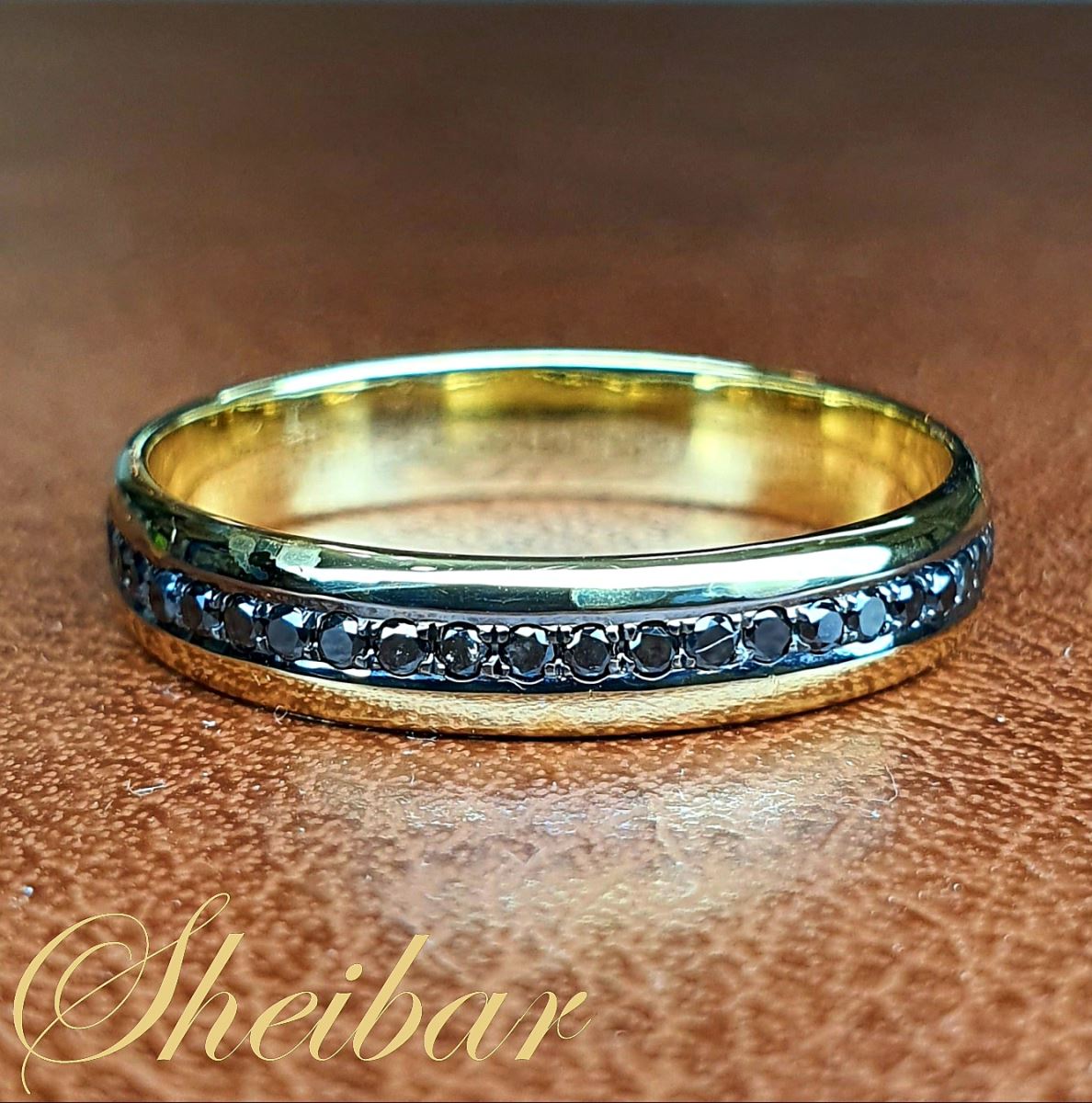 טבעת זהב משובצת יהלומים לגבר, וכן גם יכולה לשמש כטבעת נישואין קלסית לגבר. משובצת לאורך כל כולה יהלומים המתוחמים בתוך שורה אחידה ומדויקת של זהב. היהלומים שובצו בצורה צמודה, צפופה ומדויקת בכדי מלקסם את נוכחותם ונצנוצם של היהלומים. לאורך כל הטבעת משובצים יהלומים שחורים ועדינים, היהלומים השחורים מאוד מורגשים ובולטים על גבי הזהב. טבעת זו יכולה גם להגיע כטבעת נישואים חלקה ולאחר מכן ניתן לשבץ עליה את היהלומים.