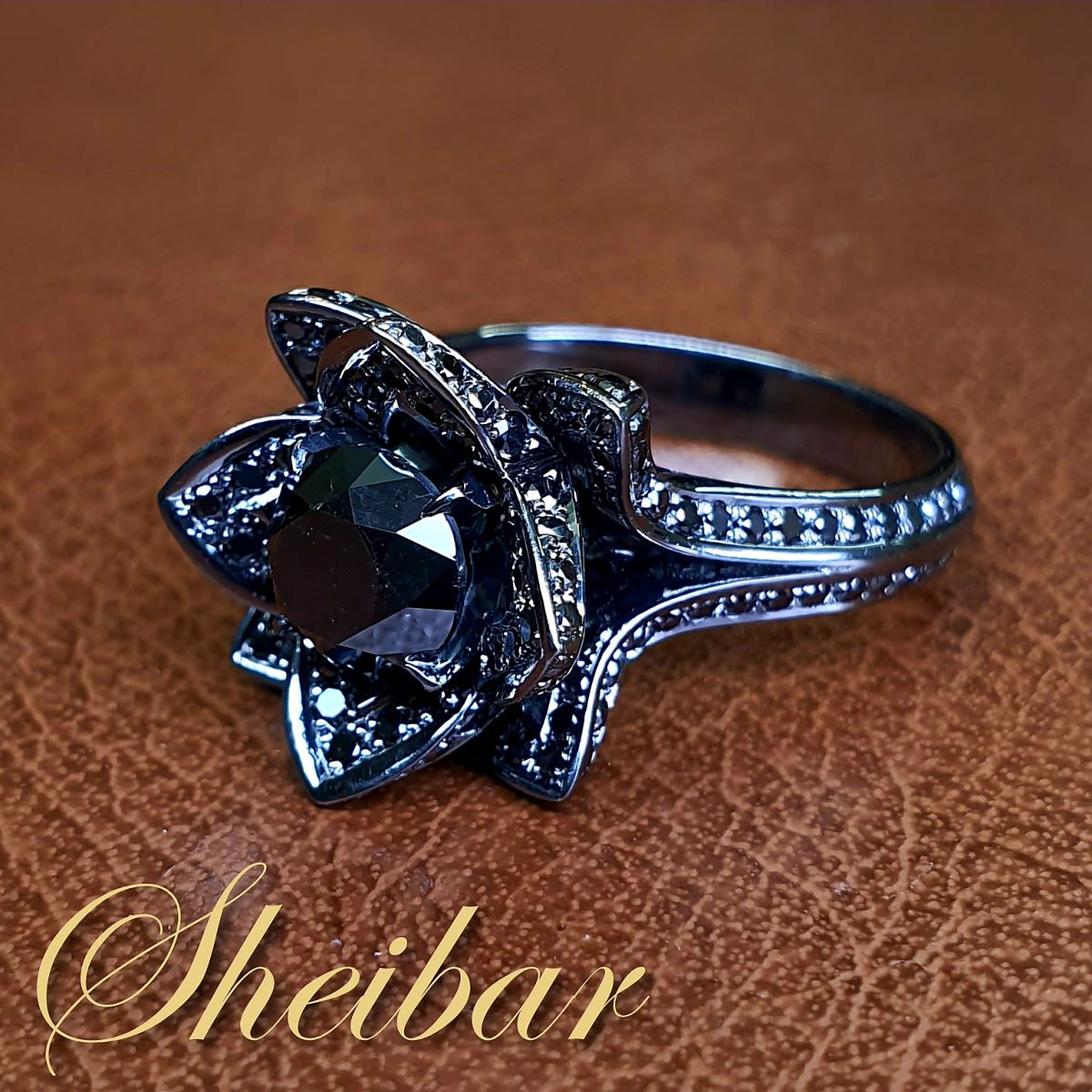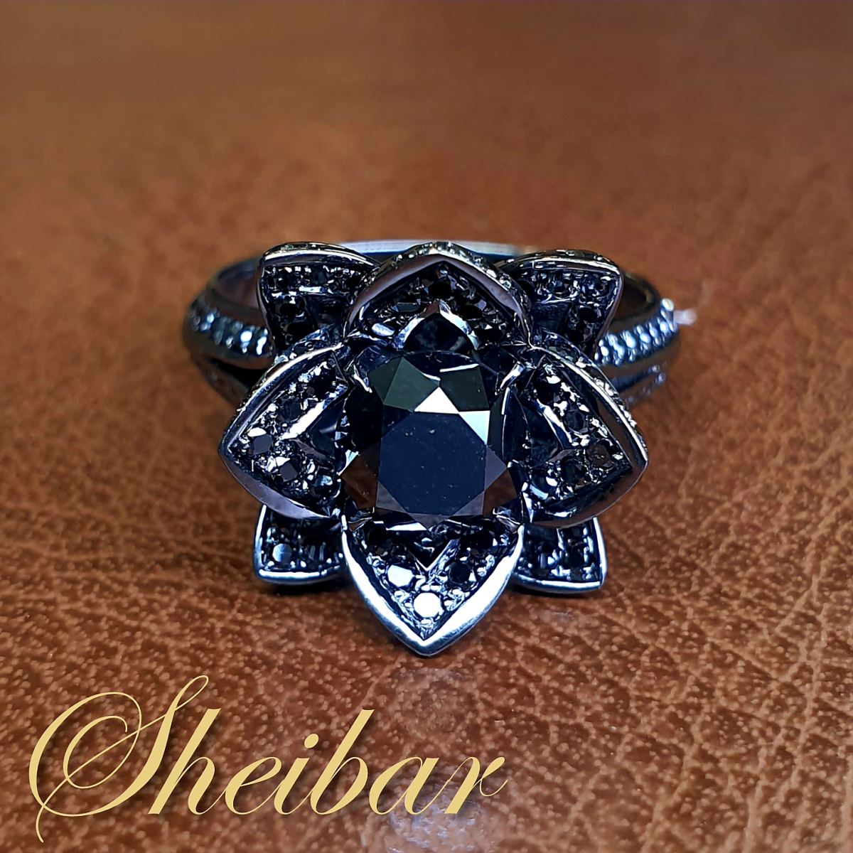 טבעות יהלומים שחורים , טבעת "לוטם שחור". טבעת עם ללא ספק אחת מהעבודות המיוחדות ויותר מרשימות שיש. טבעת שנעשתה בעיצוב אישי ומיוחד. הטבעת נעשתה בעבודת יד ברמה הגבוהה ביותר והאיכותית ביותר. בראש הטבעת אפשר לראות את עבודת העלים המיוחדת והמרשימה, כאשר כל עלה ועלה נעשה במיוחד ולפי מידות. בכל עלה משובצים יהלומים שחורים קטנים ויפים המוסיפים לנראות של העיצוב. משני צידי הטבעת ישנם 2 שורות יהלומים עדינים העולים כלפי מעלה. במרכז הטבעת ניתן לראות את היהלום השחור המרכזי שנמצא בין כל העלים בטבעת, ובעל נוכחות מרשימה ויפה. טבעת עם יוקרתיות רבה ונוכחות.