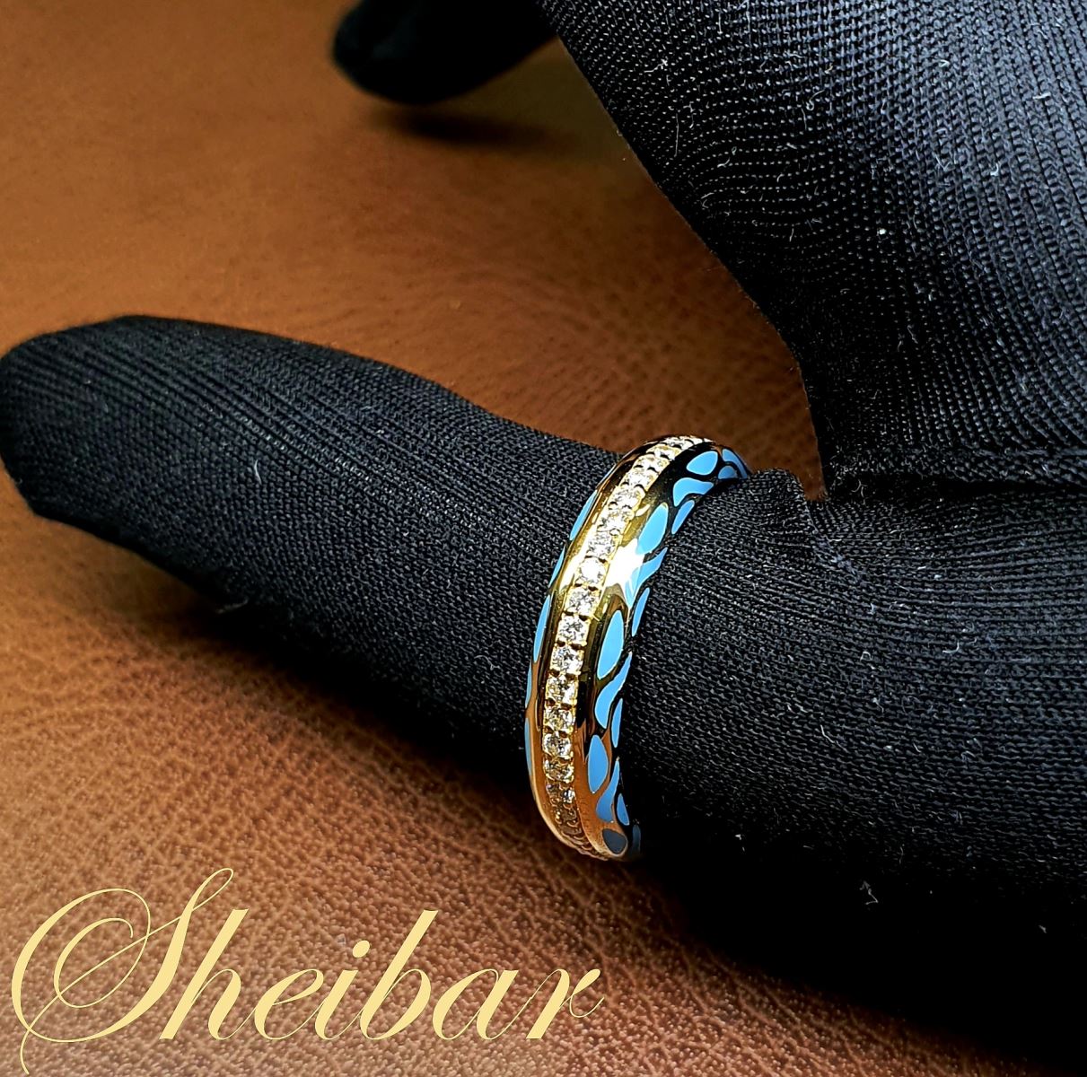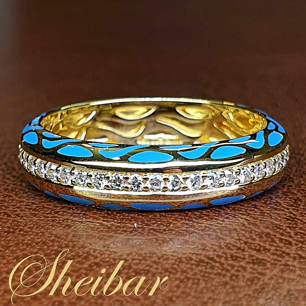 טבעת מעגל יהלומים אמייל. טבעת בעיצוב מיוחד עם שילוב של חומר "אמייל" המיוחד. טבעת שמשובצת לכל אורכה יהלומים, ומשני הצדדים שילוב מעוצב של אמייל. בחלק הפנימי של הטבעת נעשתה עבודה מיוחדת שנקראת "ביזה", וזאת כדי לשמור על נוחות בענידת הטבעת. הטבעת עשויה זהב 18K איכותי. טבעת מיוחדת ומרשימה.