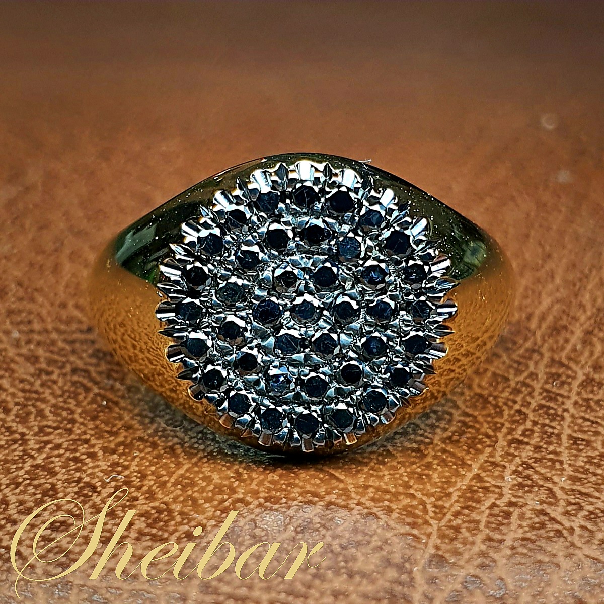טבעת חותם יהלומים שחורים. טבעת יפייפה ומרשימה. התוספת המיוחדת לטבעת היא עבודת הזהב בין היהלומים ומסביב למסגרת. עבודה במודל מיוחד שנותן דיוק גבוהה לכבודת הזהב והחתכים מסביב למסגרת. הטבעת ממרכזה למטה ועד כלפי מעלה עולה ומתרחבת בצורה עגולה חלקה ומושלמת כדי לוודא נוחות מקסימלית בענידת הטבעת.