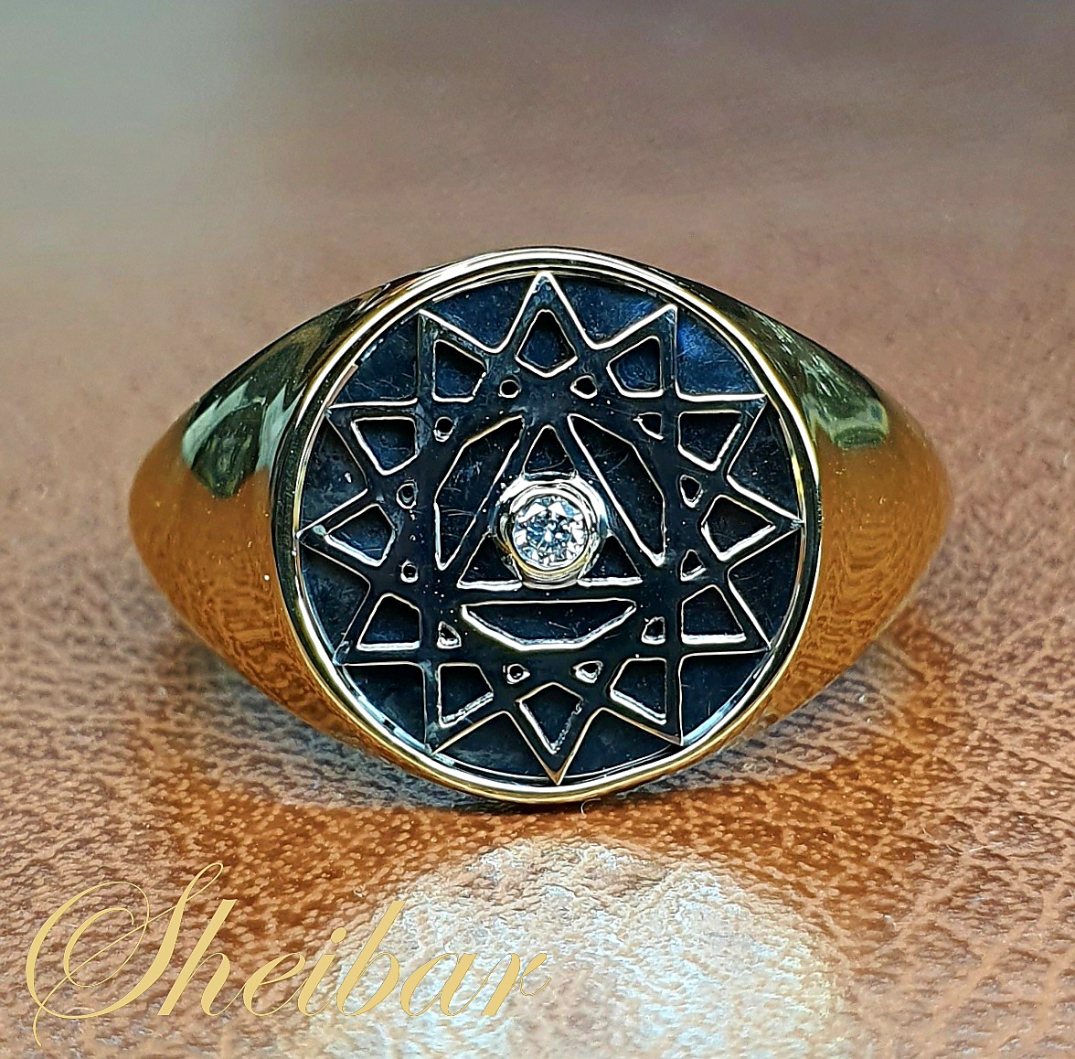 טבעת לגבר חותם שלמה. טבעת לגבר יפה ומעוצבת של "חותם שלמה". טבעת זהב צהוב משולבת עם רודיום שחור על כל ראש הטבעת. כאשר מרכז משובץ יהלום עדין.
