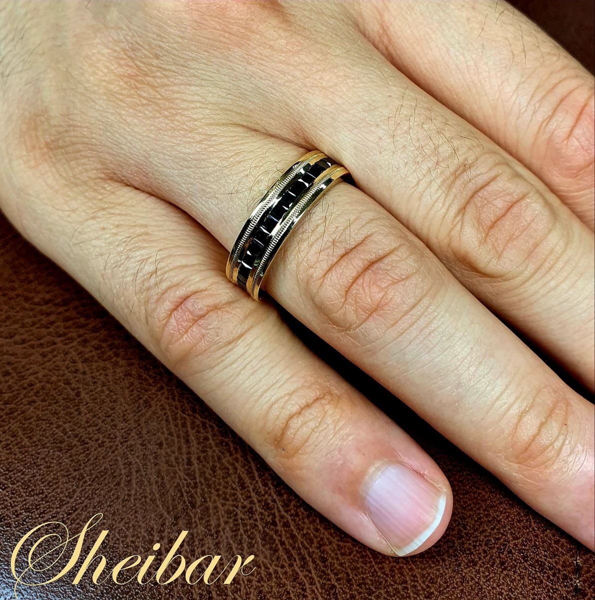 טבעת יהלומים שחורים לגבר- טבעת מילגרין שחור. טבעת מעוצבת ומרשימה לגבר. גלגל יהלומים שחורים בליטוש "פרינסס" מרובע, כאשר שיבוץ היהלומים השחורים הוא לכל אורך הטבעת. בנוסף משני צידי היהלומים נעשתה עבודת זהב עדינה של פסים כדי להוסיף לעיצוב הטבעת. טבעת מרשימה ומיוחדת