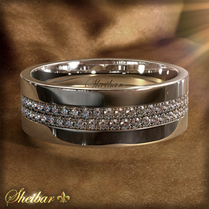 טבעת "גלגל לגבר". טבעת שטוחה העשוייה זהב 18K מזהב מלא, השוקלת כ10.5 גרם זהב. על הטבעת משובצות 2 שורות של יהלומים לבנים (כ-100 יהלומים). 2 השורות משובצות בצורת "זיגזג" בצמוד זה לזה לאורך כל הטבעת בשיבוץ "פווה". טבעת מרשימה ביופייה..! (ניתן לשבץ מספר שורות של יהלומים בטבעת לפי בחירה)
