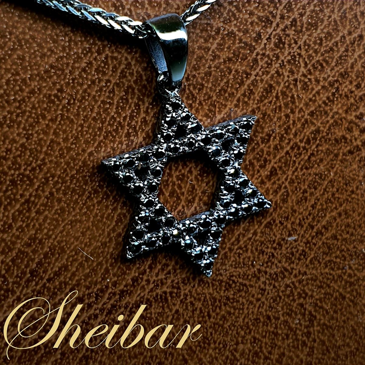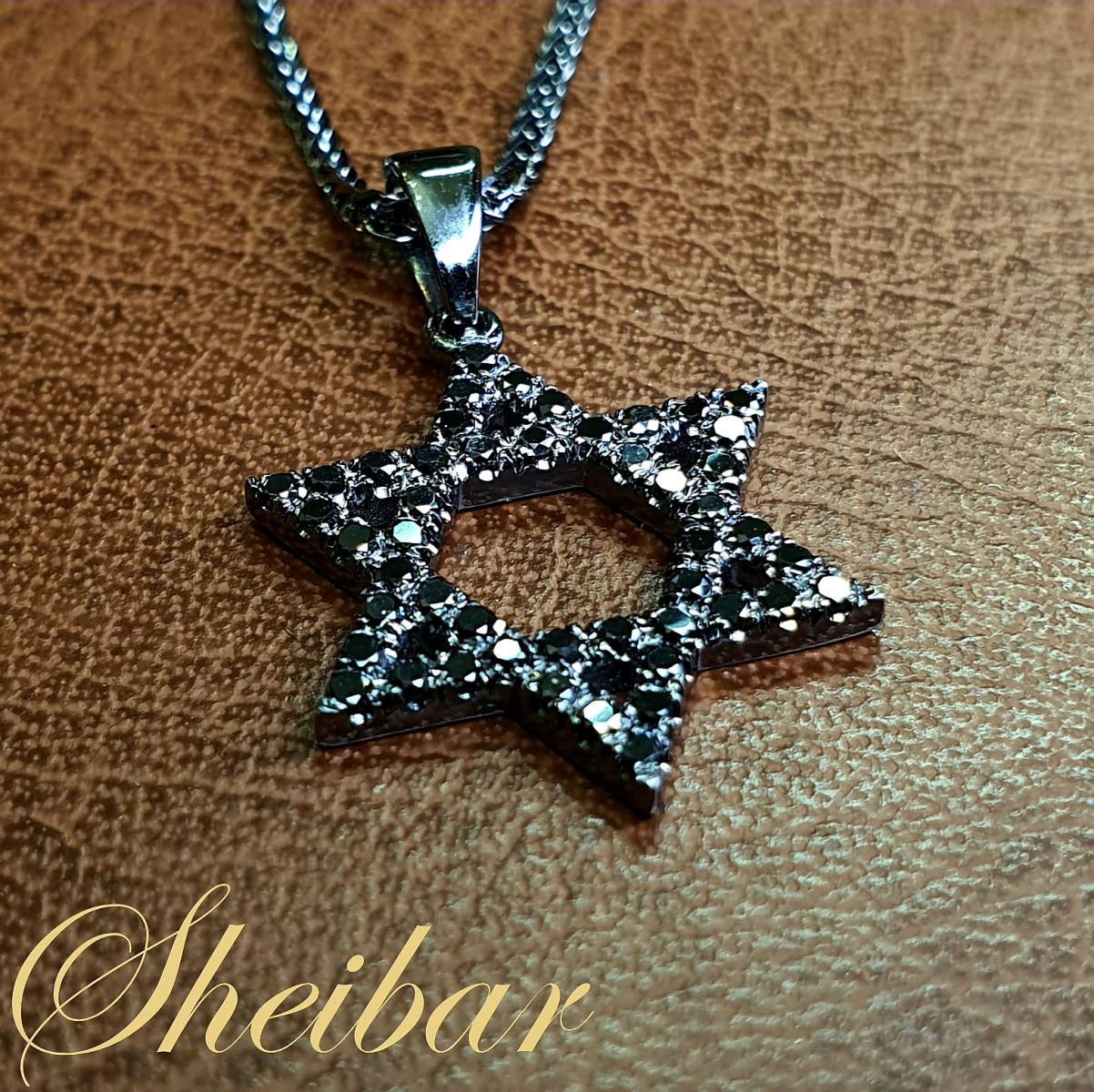תליון "מגן דוד", משובץ כולו יהלומים איכותיים בשיבוץ סימטרי ויישר. שיבוץ היהלומים הוא שיבוץ שיניים, הנעשה בצורה צפופה ביותר. שיבוץ זה מבליט כל יהלום בצורה ייחודית משלו, ובנוסף נותן דגש לכל יהלום. הדבר היפה והשונה בתכשיט זה הוא היהלומים השחורים. הצבע השחור של היהלומים עם שילוב הצבע של הזהב נותן דגש יפה ומרשים ליהלומים ולתכשיט. תליון קלאסי ועדין. ניתן להוסיף יהלומים בנוסף על מתלה התכשיט, מה שיוסיף עוד ייחודיות. (מידותיו של התכשיט לרוחב כ 1.2 ס"מ ולאורך כ 1.4 ס"מ)
