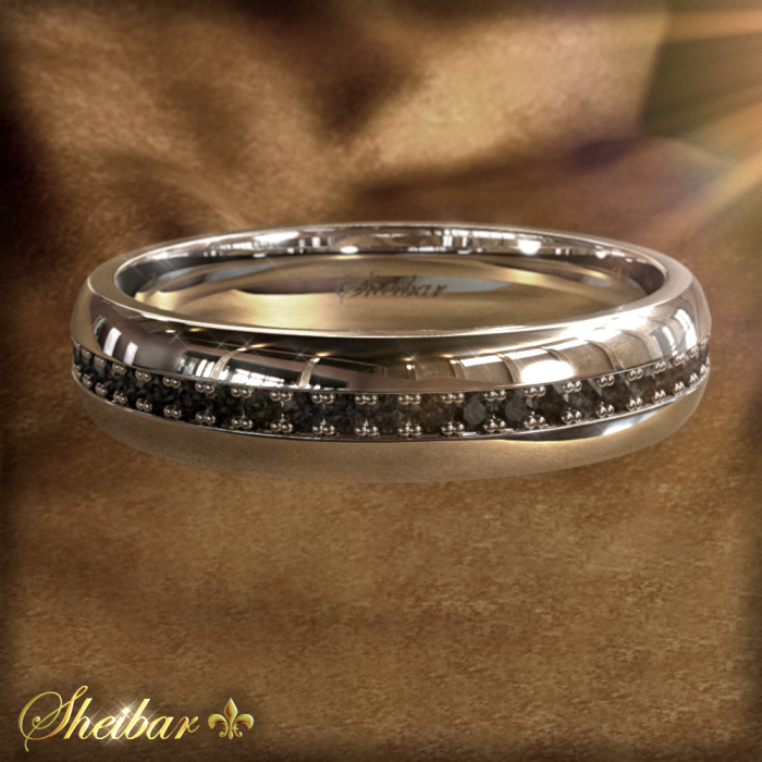 טבעת זהב משובצת יהלומים לגבר, דגם "SHEIBAR" יכולה לשמש כטבעת נישואין קלאסית לגבר. משובצת לאורכה יהלומים המתוחמים בתוך שורה אחידה ומדויקת של זהב. היהלומים שובצו בצורה צמודה, צפופה ומדויקת בכדי למקסם את נוכחותם ונצנוצם. לאורך כל הטבעת משובצים יהלומים שחורים ועדינים. היהלומים השחורים מאוד מורגשים ובולטים על גבי הזהב. טבעת זו יכולה גם להגיע כטבעת נישואים חלקה ולאחר החתונה ניתן לשבץ עליה את היהלומים.
