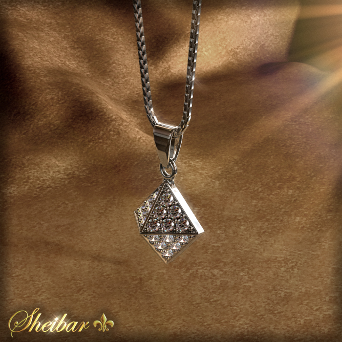 שרשרת יהלומים, תליון "פירמידה". תליון המעוצב בצורה קלסית ויפה, כאשר חלקו האחורי של השרשרת מגיע בצורה שטוחה וחלקה עם חריצים. זאת על מנת לאפשר נוחות מקסימלית בזמן ענידת התליון על הגוף. בחלקו הקדמי של התליון ניתן לראות עבודה מיוחדת שנעשתה בצורת "פירמידה" שהולכת כלפי חוץ. השיבוץ מתחיל מחלקו העליון ולאט לאט משובץ לכיוון האזור החד שבקצה, ובכך ממקסם את התכשיט במקסימום יהלומים. סגנון עבודת פירמידה זו היא עבודה מיוחדת הנותנת אפקט יוקרתי, נוצץ ומרשים במיוחד לתליון. שיבוץ היהלומים בנוסף נעשה בשיבוץ שיניים העדין והמרשים. תליון עדין, ובמקביל מפגין נוכחות מהממת של ממש!