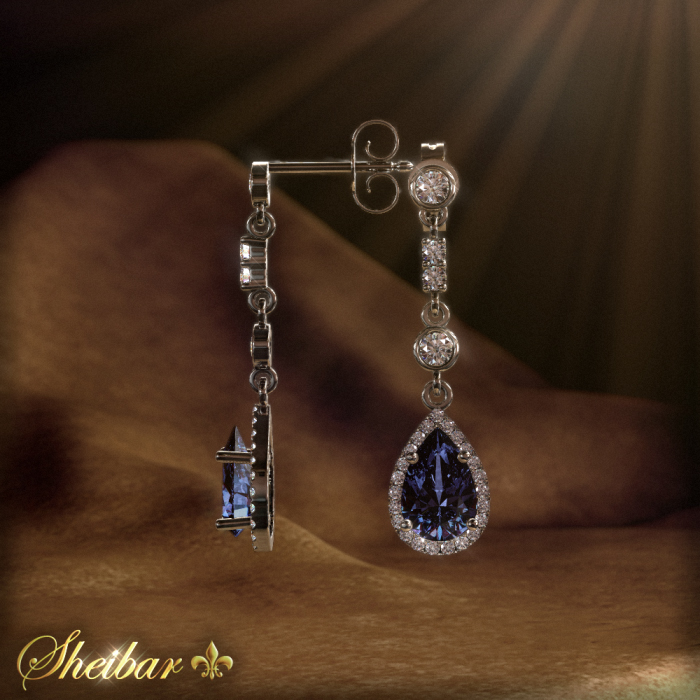 עגילי ספיר ויהלומים, עגילים בעיצוב נופל ומרשים ביותר. כאשר במרכז התכשיט משובצת טיפה מרהיבים ביופייה בצבע כחול (אבן ספיר) אבן מאד יוקרתיות ונחשקת. מבנה התכשיט ועיצובו נעשו במודל מיוחד בכדי לשמור על סימטריות ועבודה גבוהה. עגילי תליה אלו משדרים עדינות רבה ונוחות מאוד גבוהה... ובמקביל נותנים יוקרתיות רבה למה שהם מציגים. ניתן לראות יהלומים משובצים לגבי כל אורך התכשיט בגדלים שונים, ובסופו ניתן לראות את האבן חן היפה והמרשימה בצורת טיפה (PEAR), ליטוש יפה ומיוחד במינו. עגילי יוקרה ובמקביל עדינות רבה...