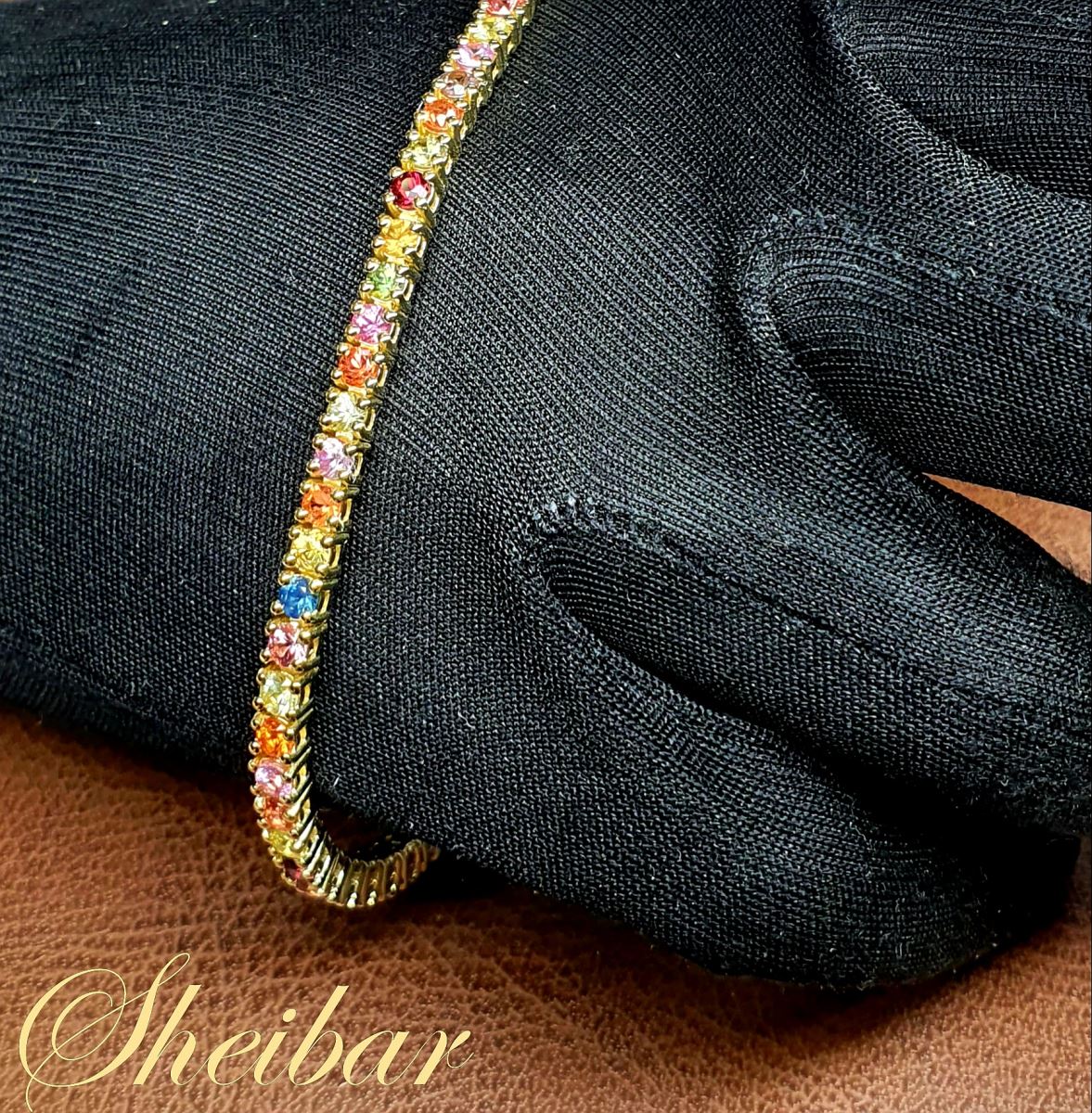 צמיד טניס משובץ ספירים צבעוניים טבעיים בעיצוב קלאסי ואיכותי. צמיד טניס זה משובץ בשיבוץ שיניים המיוחד. מה שיפה בתכשיט ושיבוץ זה הוא "החשיפה" והנוכחות שיש לאבני חן בשיבוץ השיניים. יש אפשרות לכניסה ויציאה של אור דרך האבנים ובכך מביא לנצנוץ מרבי לתכשיט. צמיד טניס קלסי גמיש ונוח לענידה.