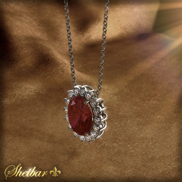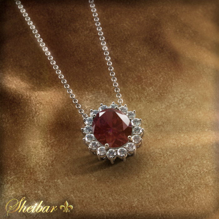 תליון רובי ויהלומים, מודל הנסיכה דיאנה בעיצוב וינטג’. בתליון זה ניתן לראות קודם כל את האבן חן המרשימה שבמרכז התכשיט, אבן רובי אדומה צלולה ויפה. אבן זו לוטשה בצורת "אובל", חיתוך מיוחד ויפה. מסביב לאבן חן זו שובצו יהלומים גדולים ויפים אשר הם חלק בלתי נפרד מתליון זה ונותנים אפקט יוקרתי ומרשים ביותר באמצעות ה"כתר" שהם יוצרים מסביב לאבן. עבודת הזהב נעשתה בצורה מדויקת ביותר, כאשר בגב התכשיט ניתן לראות את "קשתות" הזהב העדינות והיפות אשר מחזיקות את היהלומים מסביב. השרשרת 14K מולחמת ישירות לתליון. ללא ספק תליון מרשים ביותר.