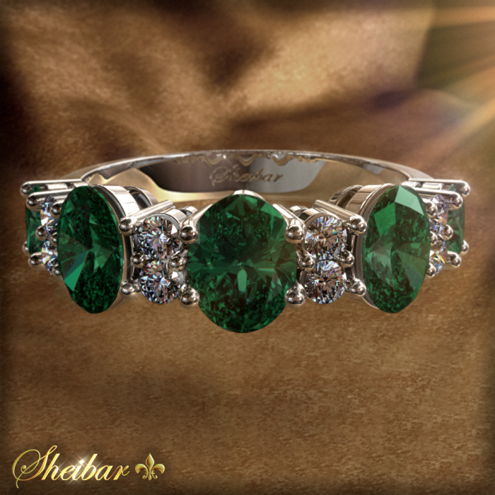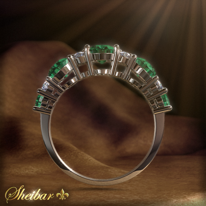 טבעות אמרלד ויהלומים, מודל "עלמת החן", טבעת בעיצוב שונה ומיוחד. ניתן להבחין ישר בראש ובראשונה לסגנון השיבוץ והאבנים המרכזיות שבתכשיט. ניתן לראות כ-5 אבנים מרכזיות ששובצו באבני חן "אמרלד", אשר תחילה השיבוץ נעשה מהצדדים, ולקראת החלק העליון של הטבעת גודל האבנים הולך וגדל עד שמגיעים למרכז הטבעת ושם ניתן לראות את האבן הגדולה והמרשימה ביותר. עבודת שיבוץ מדויקת ומרשימה, בעוד שבין כל 5 האבנים המרכזיות ניתן לראות כ-2 יהלומים המפרידים בין כל אחת מהם ובכך נותנת דגש מלא ואת מרב צומת הלב לכל אבן בפני עצמה. עבודת גימור וליטוש גבוהה מרשימה ויפה. ללא ספק תכשיט מיוחד במינו...! (ניתן בהזמנה מראש לשבץ את כל סוגי אבני החן לפי בחירה)