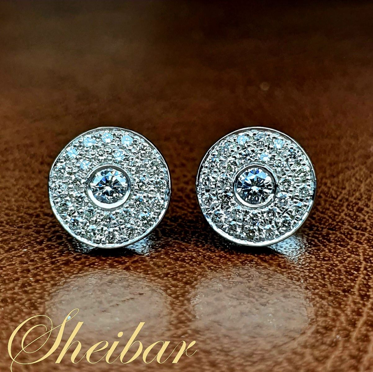 עגילי יהלומים צמודים- עגילי מגש יהלומים. עגילים קלסיים מלאים בנוכחות מרשימה. כל מסגרת העגיל משובצת במשטח שטוח ויפה של יהלומים נוצצים ויפים, מהמסגרת ועד המרכז. במרכז שיבצנו יהלום מרכזי מעט גדול יותר כדי שיוסיף לאפקט היפה והנוצץ של העגיל. בזכות השיבוץ הצפוף של היהלומים, רואים רק יהלומים מנצנצים (כמו שטיח נוצץ ויפה). עגיל קלסי יפה ומרשים. מתנה מושלמת.