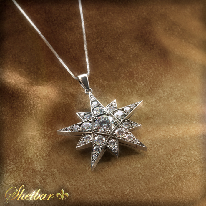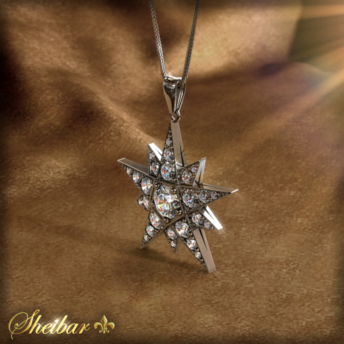 תליון "כוכב ויקטוריאני", בעיצוב יפיפה בשילוב שיבוץ יהלומים מנצנצים ואיכותיים. במרכז התכשיט ניתן לראות יהלום מרכזי ומרשים, המוחזק באמצעות 5 שיניים עדינות. ממרכזו של יהלום זה ניתן לראות את פסי הזהב הנוספים שיוצאים לכל כיווני התכשיט ועל גביהם משובצים יהלומים בגדלים שונים, וזאת על מנת למקסם את כל זוויות התכשיט בשיבוץ נוסף של יהלומים. עבודת הגימור של הזהב חשובה ביותר לעבודת עיצוב התליון, ולכן נעשתה בעבודה וברמה גבוהה להפליא. שיבוץ וגימור מעולה כמו כן מודל התכשיט עוצב בעבודת צורפות איכותית ויוקרתית.(רוחב התכשיט כ-2.2 ס"מ ואורכו כ-2 ס"מ)