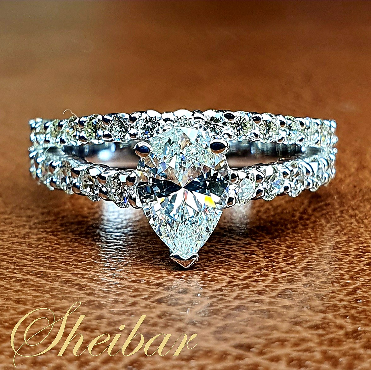 טבעת אירוסין מרשימה עם יהלום טיפה, טבעת "טיפה של אושר". אחת הטבעות המשלבות גם נוכחות מרשימה ביותר וגם עיצוב מיוחד במינו בשילוב של יהלום בליטוש מיוחד ושונה. הטבעת נעשתה במודל מחשב מיוחד כדי לוודא שהעבודה תצא ברמה המדויקת ביותר. בסיס הטבעת מתחיל במקשה אחת, וכאשר אנחנו מתחילים לעלות אנחנו רואים את הטבעת מתפצלת ל2 חלקים. כאשר צד אחד הוא הצד העדין יותר אשר עליו משובצים יהלומים יפים בשיבוץ "שיניים". בצד השני שהוא גם הצד הרחב יותר והמרשים עוד יותר, משובצים יהלומים גדולים יותר ובכך מוסיפים לנוכחות של הטבעת. אחרי כל זה מגיע ה"יהלום" שבכתר. בראש כל הטבעת הזו משובץ יהלום גדול טבעי ומרשים בליטוש "PEAR" (טיפה). הליטוש המיוחד של הטיפה נותן לטבעת צורה מאורכת, ובכך מוסיף לנוכחות המרשימה ולעיצוב המיוחדת במינו. ללא ספק טבעת עוצרת נשימה.