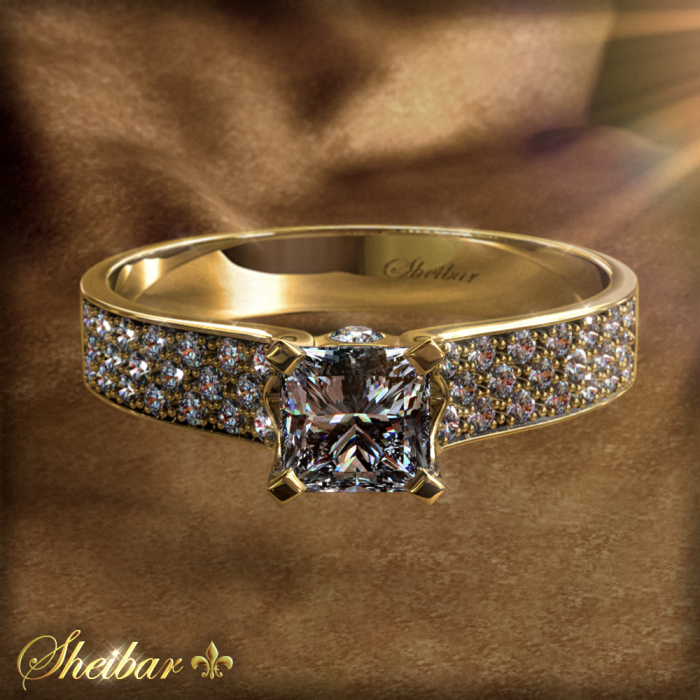 טבעות אירוסין יהלום מרובע, מודל "נסיכה". עבודת הזהב של הטבעת נעשתה כמקשה אחת בעוד שהטבעת מתחילה כחישוק ומתפתלת בחלקה העליון על מנת להרים את היהלום המרכזי בצורה המרשימה ביותר. שיבוץ היהלומים בצדדים נעשה בשיבוץ "פווה" של 3 שורות יהלומים בשני צידי הטבעת עד לחלקו העליון שלה. בנוסף בראש הטבעת ישנו יהלום אחד משובץ בשני צידי הפרופיל. בראש הטבעת משובץ יהלום מרובע "PRINCESS" המקביל ברוחבו לטבעת במטרה לשמור על רמת סימטריות מדויקת וייחודיות לטבעת.