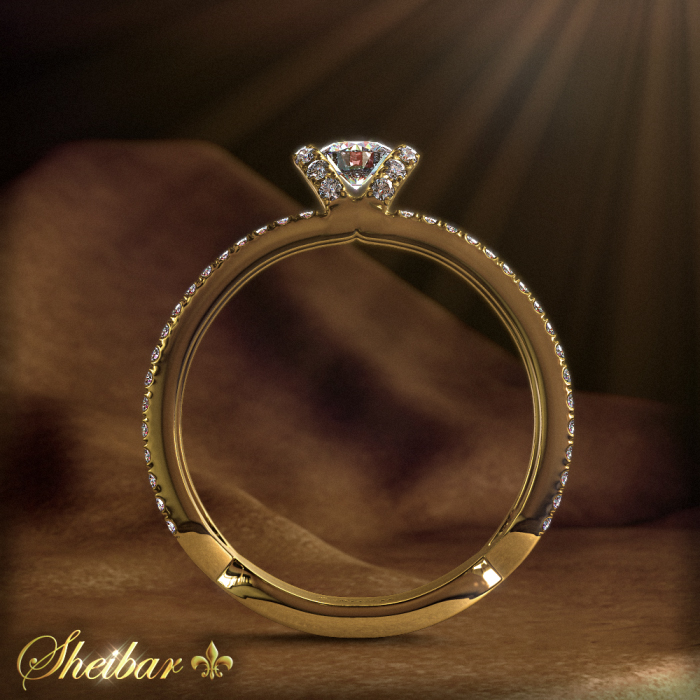 טבעות אירוסין, מודל "שאפו" אשר מגיע בהחלט שאפו לאדם שחשב על העיצוב הייחודי הזה. בבסיס הטבעת ישנו חלק מבריק של זהב המזכיר צורת אליפסה, בעוד שממנו יוצאים להם 2 פסי זהב עדינים וסימטריים כל כך בכדי לשמור על צורת הטבעת ישרה לאורך כל התכשיט. על 2 שורות זהב אלו ניתן לראות עבודת שיבוץ עדינה ומקצועית להפליא בכדי להמשיך ולשמור על סימטריות ויופיו של התכשיט. הדבר העיקרי שיש לשים לב אליו הוא ראש התכשיט המיוחד במינו ללא ספק...! משני פסי הזהב בצידי הטבעת ניתן לראות שיוצאים 2 מעגלים עדינים של זהב המדמים מראה של "עלי כותרת" כמו של פרח שנפתח רק עכשיו המשובצים גם הם ביהלומים יפים ולבנים. עלי כותרת אלו מחזיקים את ה"תכשיט" החשוב ביותר בטבעת שהוא היהלום המרכזי המדהים.