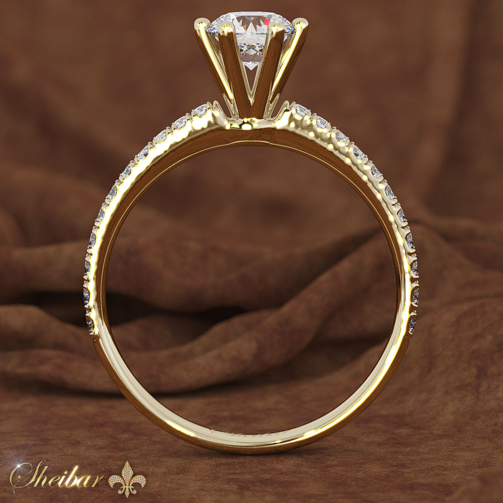 טבעת אירוסין ויהלומים - דגם: סוליטרי. טבעת אירוסין מדהימה, מלכותית, יוקרתית ובטוחה. עשויה זהב 18K זהב מלא, ובנויה בצורה שחלקה התחתון של השינה הוא רחב והולך ונהיה צר יותר לקראת הראש על מנת להדגיש עוד יותר את היהלום המרכזי. שיבוץ בצדדים שיבוץ בסגנון "דגרדה" ובו היהלומים מסודרים אחד אחרי השני על פי גודל: מהגדול - לקטן על מנת לתת דגש ליהלום המרכזי. כל יהלום בצד ממוין ומשובץ על ידי 4 שיניים. במרכזו ראש של 6 שיניים קלאסיות ורחבות במטרה להחזיק את היהלום המרכזי של 1 קראט, גבוה, בטוח ומודגש. טבעת אירוסין זו טבעת ברמה גבוהה מאוד ומושקעת ביותר!
