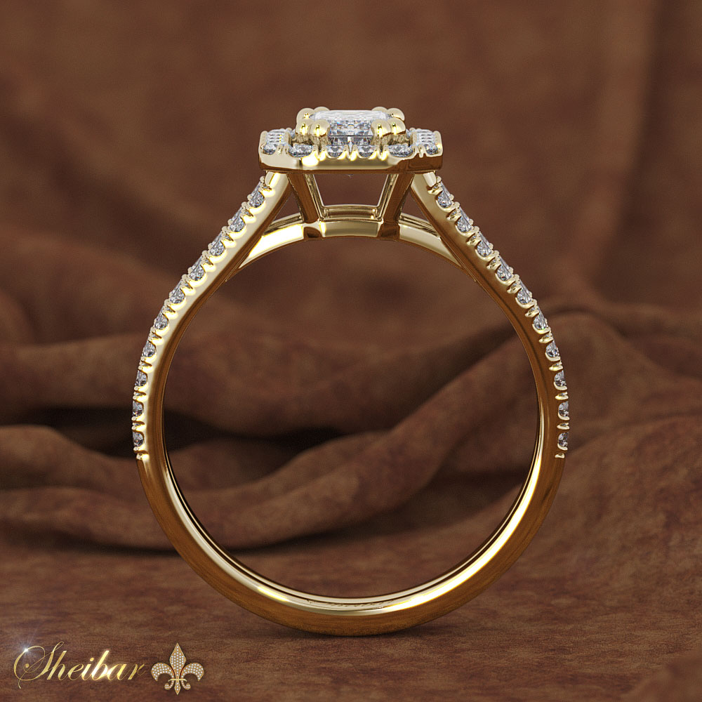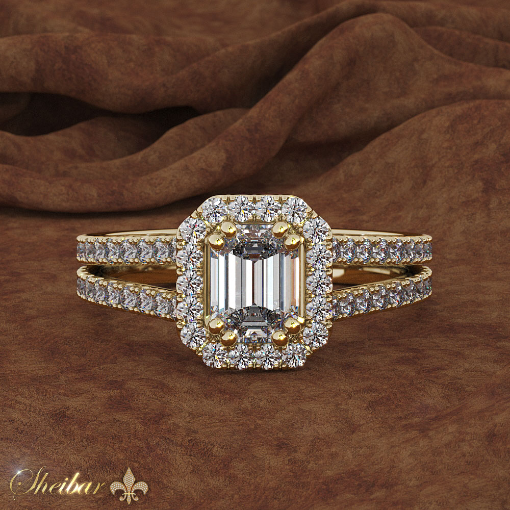 טבעת יהלומים אירוסין - טבעת שלדון - טבעת עשירה ומרשימה עשויה זהב 18 קראט משובצת במרכזה יהלום בחיתוך אמרלד מעוטר מסביבו ביהלומים קטנים שמעצימים ונותנים אילוזיה לאבן גדולה בשל צפיפות השיבוץ הקרוב למרכזית מה שנותן הרבה אור ויופי למרכז הטבעת. בצידי הטבעת 4 קשתות משובצות יהלומים בשיבוץ שיניים מיוחד שמכניס הרבה אור ליהלומים הקטנים ומקנה לטבעת מראה איכותי מרשים ונחשק.
