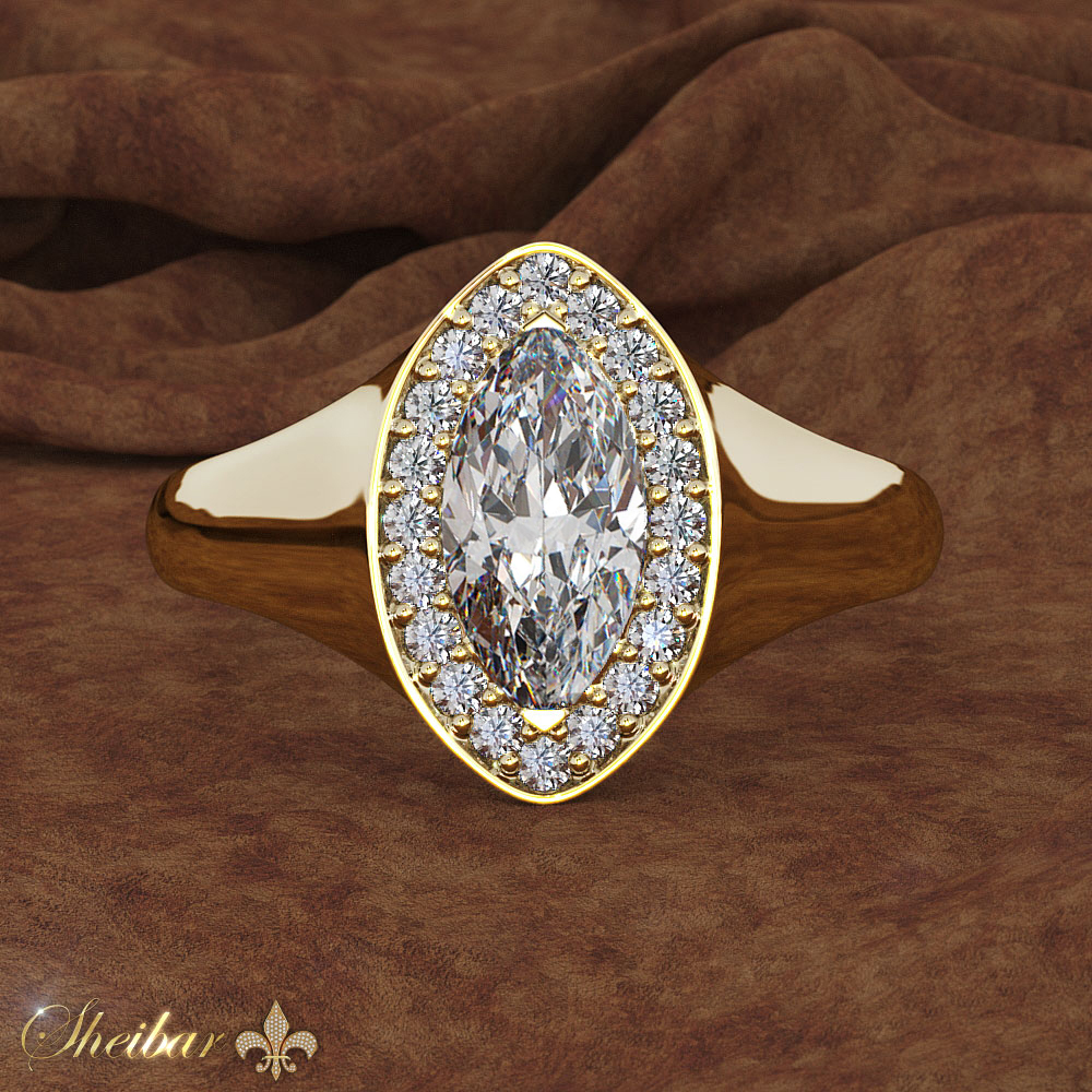 טבעות אירוסין ויהלומים- טבעת מרקיזה טבעת מרקיזה עשויה זהב 18 קראט. עיצוב הזהב מחלקו התחתון של הטבעת עד למעלה מתחבר בצורה מעוגלת מה שיוצר צורת מרקיזה כאשר במרכז הראש משובץ יהלום בצורת עין בחיתוך מרקיזה. סביב היהלום המרכזי מעוטרים יהלומים לבנים המעצימים אותו היוצרים נצנוץ ויופי למראה עתיק ואלגנטי. לחלוטין טבעת מיוחדת במינה.