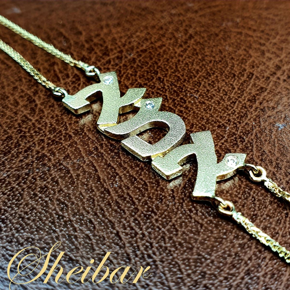 צמיד זהב "אמא" משובץ. צמיד שם איכותי מזהב מלא 14K. על כל אות משובץ יהלום נקי ולבן. כשר מכל צד יש 2 שרשראות זהב שמחוברות אליו במרכז. מתנה מושלמת לכל אמא!