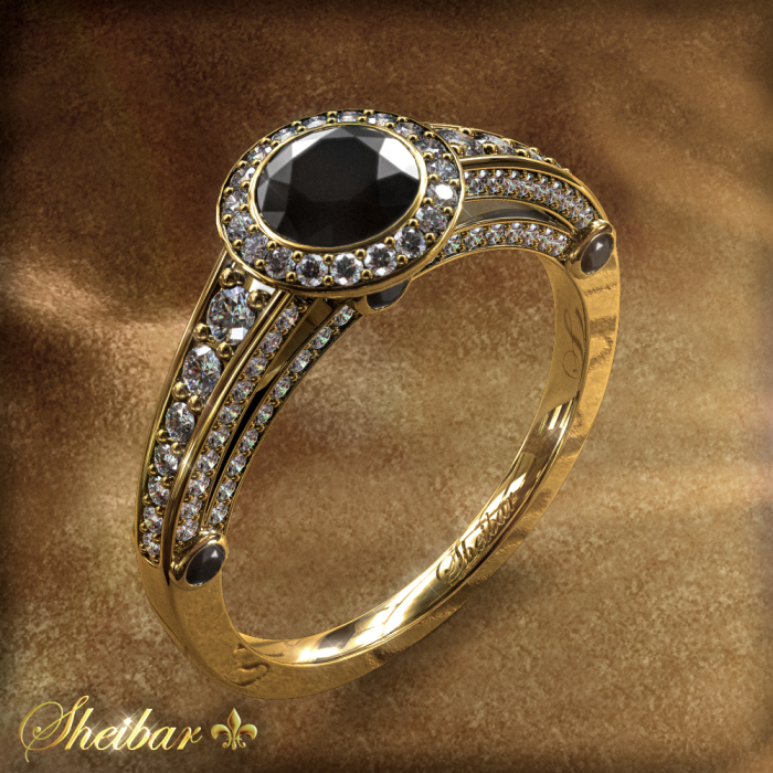 STEFFANI BLACK - A ring studded with diamonds in all its upper half of all sizes, a total of about 116 diamonds, and the ring profile can be seen in the shape of two arches studded with small diamonds that go from the ring to the center, and in the profile of the ring in addition to three large diamonds studded with black diamonds. On both sides of the ring there is a line of diamonds set in different sizes from the smallest to grow in the form of a rail, and on the top of the ring is a central diamond, a black diamond surrounded by other small white diamonds, the breaking bone and the change from white diamonds to blacks accentuates the central diamond. That Which complement the perfect result of this ring, a ring that can not be missed on any hand.