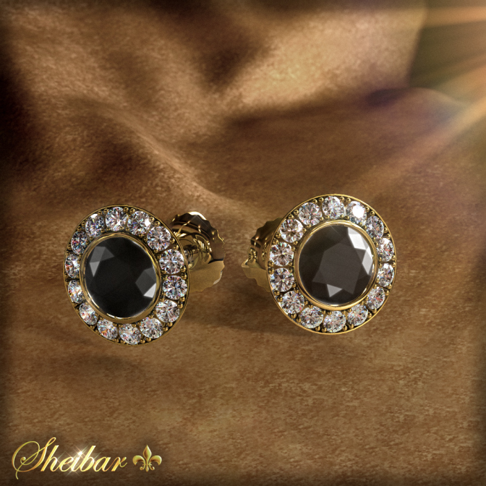 Stephanie earrings, beautifully designed earrings. You can see that in the center of each earring is a large black center diamond (you can set a diamond size of choice) with a "cup", while a thin gold band separates it from the rest of the small diamonds around it. White and clean diamonds (The combination of white diamonds and a large black diamond accentuates the diamond’s size and beauty.