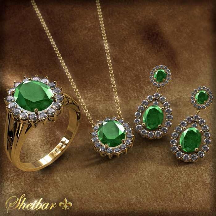 Emerald set and diamonds the impressive Diana model. Without a doubt, a prestigious jewelry set designed and unique. Each of these jewelry has its presence and uniqueness. A set that comes with: ring, earrings and chain. This set is studded with clear and beautiful green emeralds, accompanied by impressive and beautiful diamonds that add beauty and sparkle to the jewelry. A perfect set and gift for the woman you love
