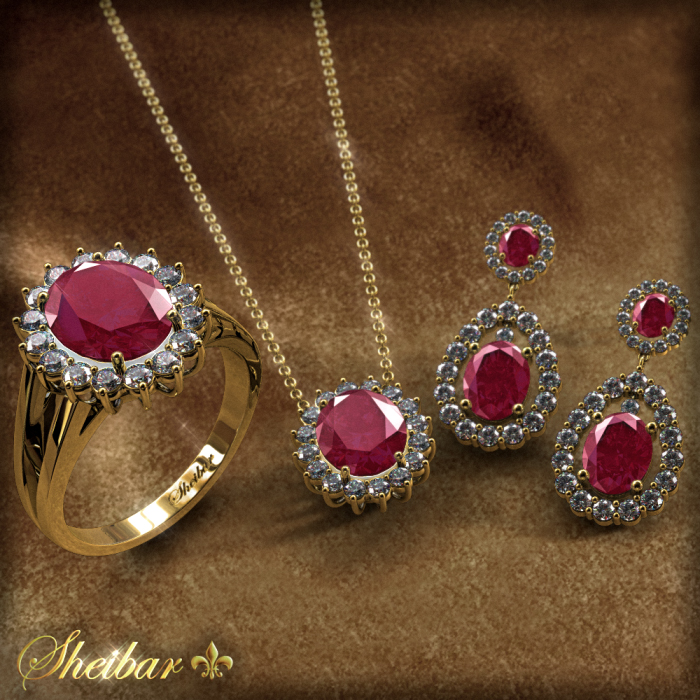 A collection of rubies and diamonds of the impressive and impressive Diana model. Without a doubt, a prestigious jewelry set designed and unique. Each of these jewelry has its presence and uniqueness. A set that comes with: ring, earrings and chain. This set features bright, beautiful red rhinestones, accompanied by impressive and beautiful diamonds that add beauty and sparkle to the jewelry. A perfect set and gift for a woman that you love