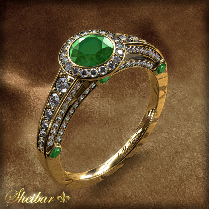 Emerald and diamond rings, the "Tiffany" model. A unique and prestigious ring, not for the faint of heart. A ring studded with diamonds in all its upper half of all sizes, a total of about 116 diamonds, and the ring profile can be seen in the shape of two arches embedded with small diamonds that go from the ring to the center, and in the profile of the ring in addition to three large gems. On the upper side of the ring is a central diamond, which comes with an emerald, green, clear and beautiful gem, surrounded by other small diamonds, and the ring itself is designed and composed of 3 different parts that complement the result The perfect ring is a ring that just can not be missed