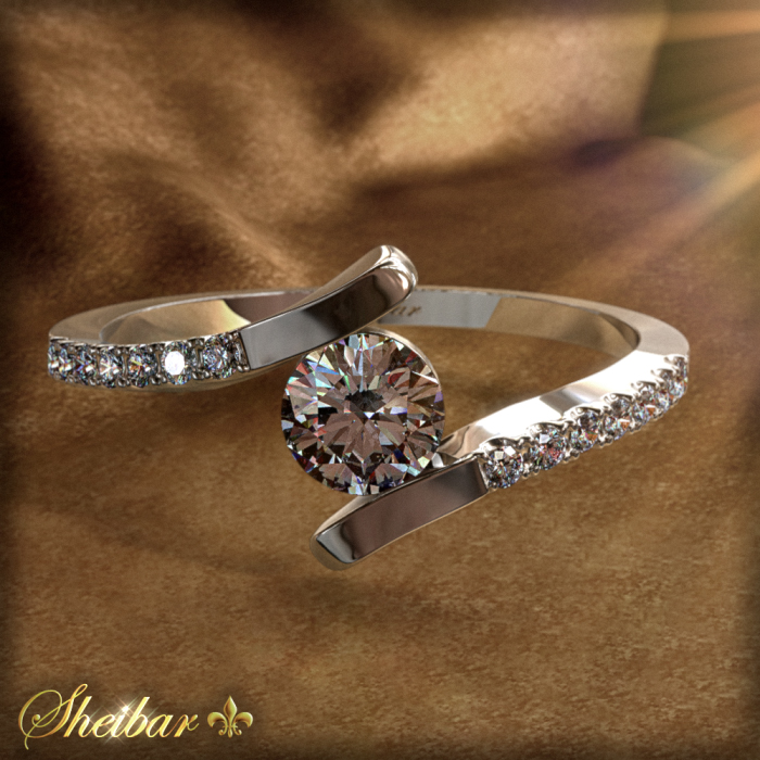 Model Engagement ring "mazal", twist ring. This engagement ring is designed in the form of its famous twist, with the ring ring starting from the base of the ring and rising up each side interpreted in another direction, creating an interesting twist. This ring is delicate in its beauty and very special. On both sides of the ring are high-quality diamonds on shiny gold, while in the center of the ring you can see a beautiful center diamond weighing 0.25 inlaid between the two golden walls of the ring without teeth and thus is at the same height of the gold without the "bump" of the diamond
