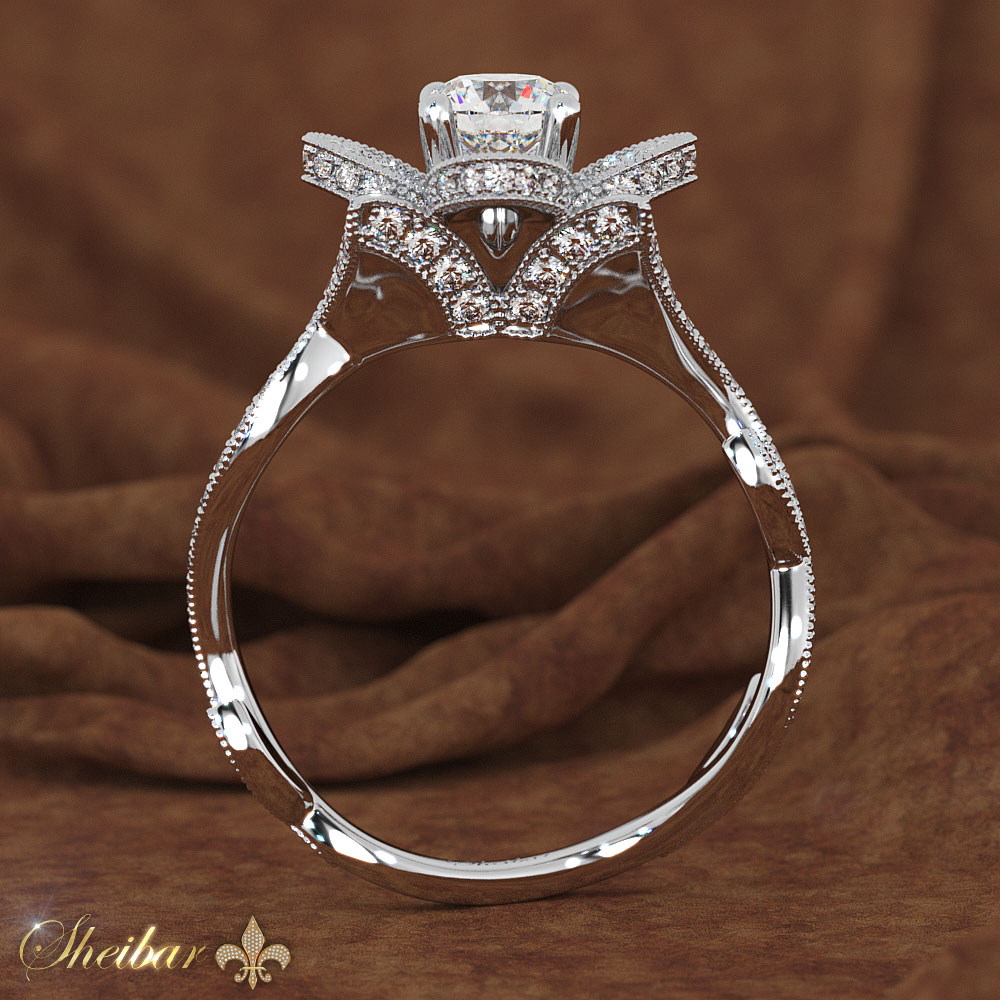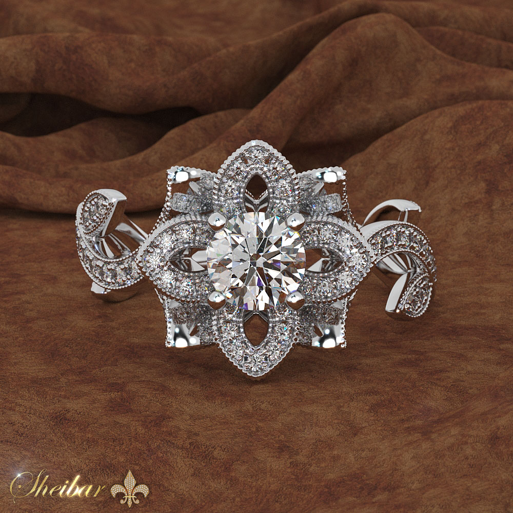 Engagement ring "Lotti". The ring is uniquely designed, made up of 3 pieces and designed in by handwork by the best professionals in the field. The ring is designed in a vintage style with an emphasis on floral style guidelines. The base of the ring overlaps the design of a flower stem with leaves, with a perfect finish and a natural diamond arrangement throughout the ring, and the head of the ring, which overlaps the design of a flower with its petals . The head of the ring is studded with a natural diamond with a 4 teeth supporting it . Add to cart Back