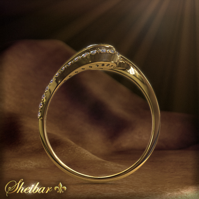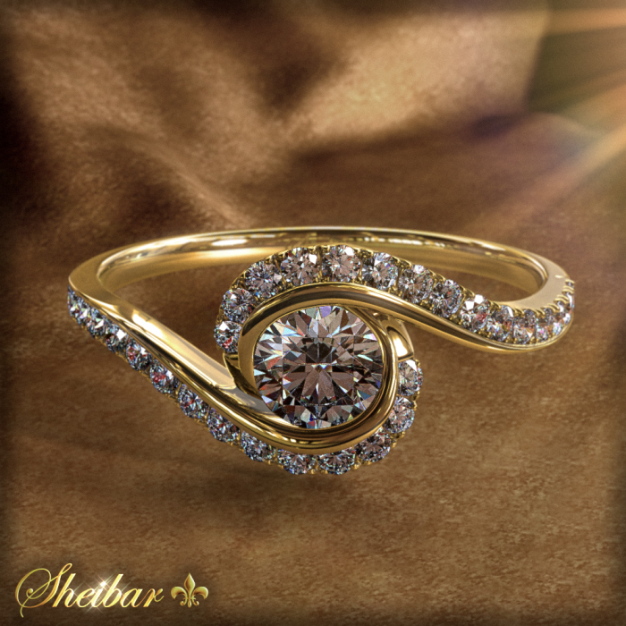 Engagement ring, "Katrina" a diamond ring. A ring by "Spiral and Twist" design with a unique and different from the other ring . The ring structure begins with a delicate, shiny gold band that curves with the upward lift. From the center of the ring you can see that the delicate and beautiful diamonds appear on the ring, and slowly next to the diamonds, a delicate gold band appears next to the diamonds and gives a shiny and impressive effect. When you reach the top of the ring, the ring structure curves and rotates until it connects to the other side of the ring. Until a ring of gold can be seen in the middle of the ring. The center of the hoop is studded with a beautiful central diamond, embedded in a "cup", which gives a feeling of a larger diamond. What is special about this ring is that the small diamonds wraps the center diamond in the center of the ring, giving a brilliant sparkling effect to the center of the ring. an unique ring