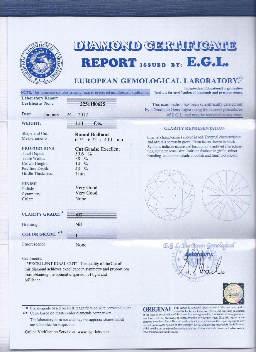 1.11 | I | SI2 | Very Good | EGL | 4900 $ | |
