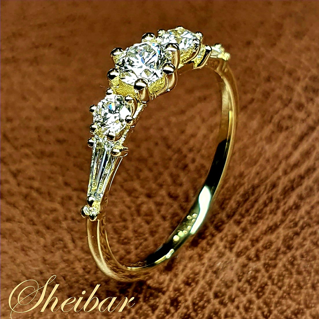טבעת זהב ויהלומים בעיצוב אישי. טבעת שנעשתה בעבודת יד שהוזמנה בעיצוב אישי. הדבר הראשון אליו ניתן לשים לב הוא למידות והגדלים השונים של היהלומים. כל יהלום נבחר בקפידה בכדי שהוא יתאים בצורה המדויקת ביותר למקום שלו. יש על הטבעת 4 מידות שונות של יהלומים, שבינהם ניתן לראות יהלומים בליטוש מיוחד ששלו "טפר". "טפר" הוא ליטוש מוערך שהולך ונהיה צר לאורך היהלום, זה מה שעושה אותו למיוחד במינו ולליטוש מיוחד. הטבעת נעשתה בזהב 18K. ניתן להזמין את הטבעת בזהב צהוב/לבן/אדום. טבעת שונה ומיוחדת במינה.