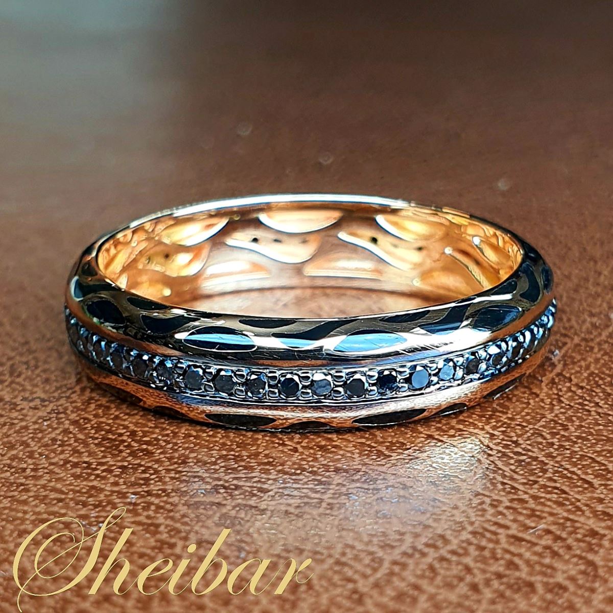 טבעת מעגל יהלומים אמייל. טבעת בעיצוב מיוחד עם שילוב של חומר "אמייל" המיוחד. טבעת שמשובצת לכל אורכה יהלומים, ומשני הצדדים שילוב מעוצב של אמייל. בחלק הפנימי של הטבעת נעשתה עבודה מיוחדת שנקראת "ביזה", וזאת כדי לשמור על נוחות בענידת הטבעת. הטבעת עשויה זהב אדום 14K איכותי. טבעת מיוחדת ומרשימה. משובצת יהלומים שחורים לכל אורך הטבעת.