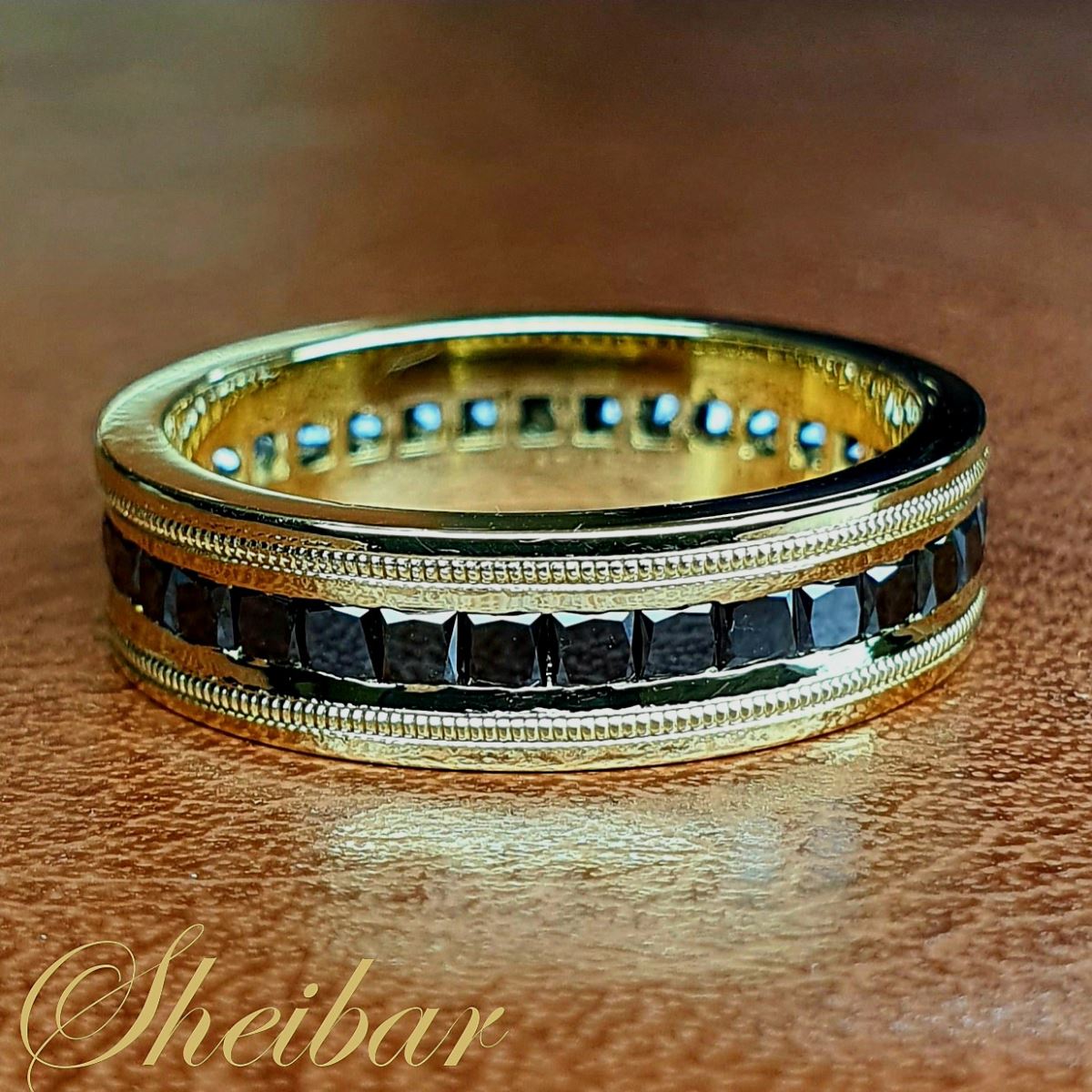 טבעת יהלומים שחורים לגבר- טבעת מילגרין שחור. טבעת מעוצבת ומרשימה לגבר. גלגל יהלומים שחורים בליטוש "פרינסס" מרובע, כאשר שיבוץ היהלומים השחורים הוא לכל אורך הטבעת. בנוסף משני צידי היהלומים נעשתה עבודת זהב עדינה של פסים כדי להוסיף לעיצוב הטבעת. טבעת מרשימה ומיוחדת