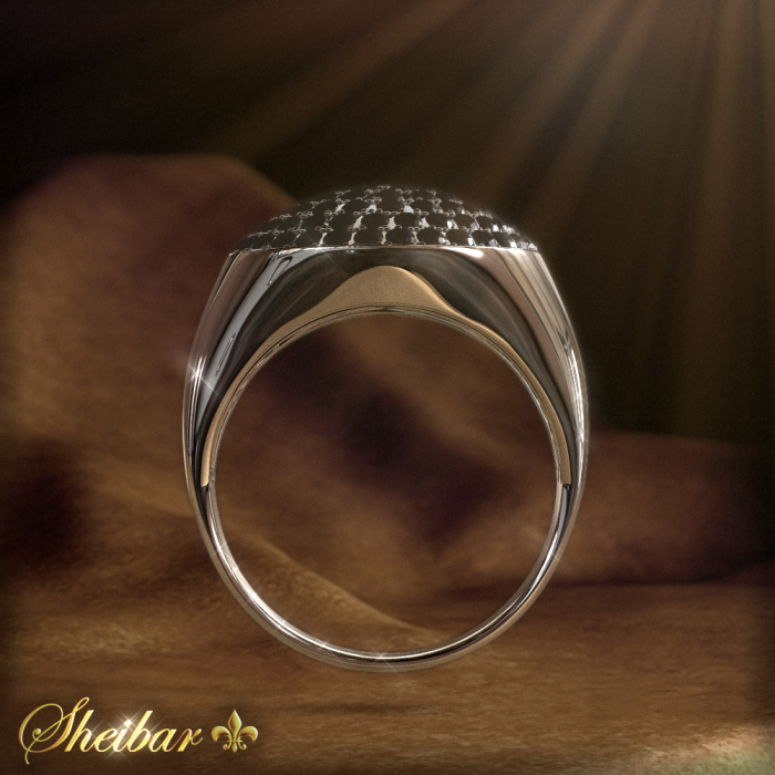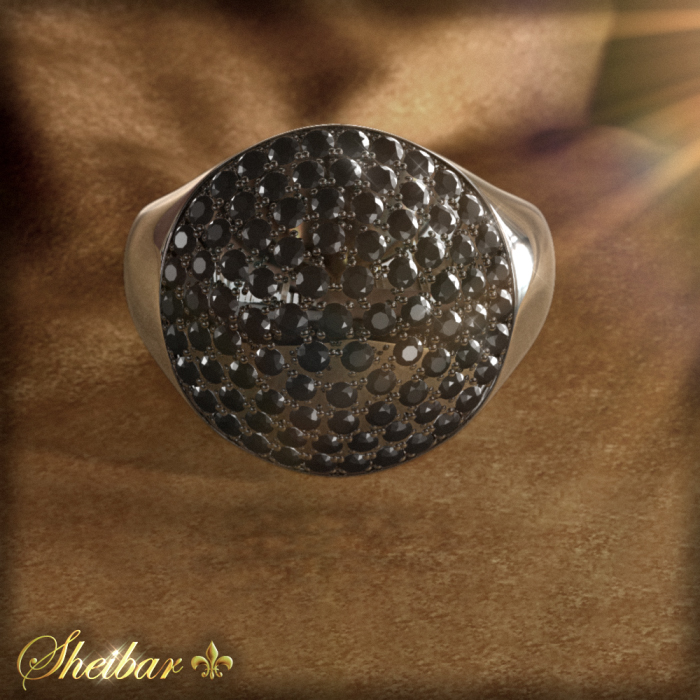 טבעת יהלומים שחורים, טבעת מיני בומביי, טבעת מרשימה ויוקרתית. ליטוש ועבודת הזהב נעשתה בעבודת יד חלקה ועדינה בכדי לשמור על נוחות ענידת הטבעת ויופייה. כל מבנה הטבעת נעשה בעבודה מעוגלת ונוחה. על גבי ראש הטבעת ניתן לראות כ-90 יהלומים שחורים המשובצים במעגלים ובכך ממקסם את כמות היהלומים בראש הטבעת. שיבוץ היהלומים נעשה בשיבוץ שיניים. טבעת יוקרתית ומיוחדת...