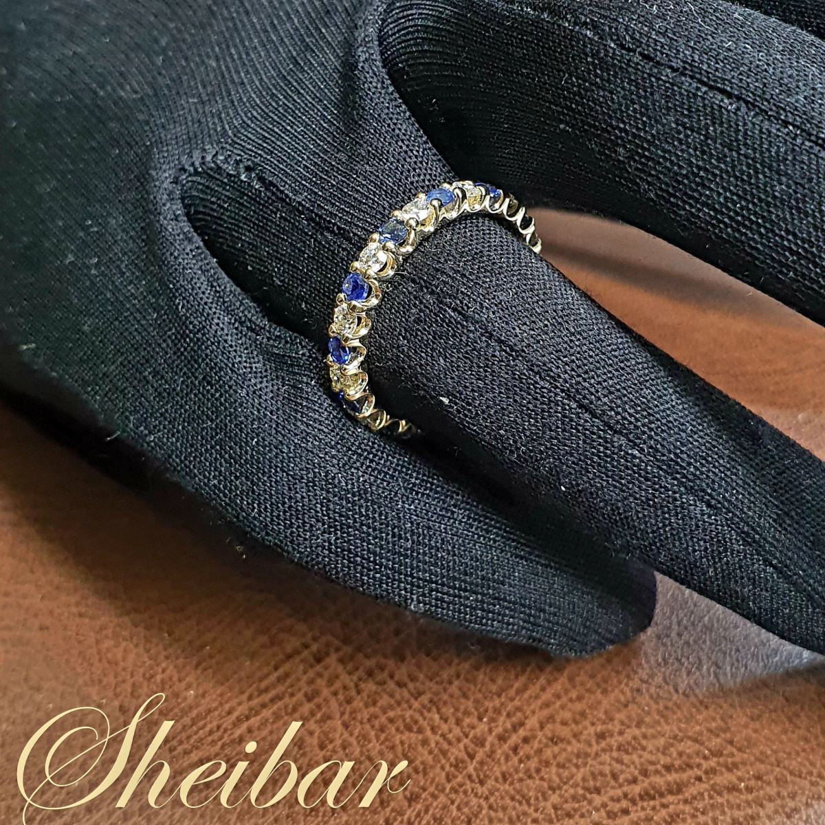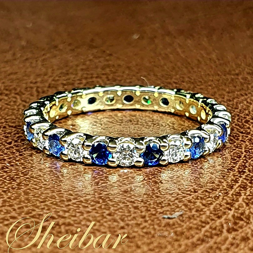 טבעת יהלומים "גלגל איטרניטי’ , טבעת בשיבוץ מלא המשלב יהלומים ואבני ספיר טבעיים. טבעת מרשימה ויוקרתית זו דורשת עבודת דייקנות ברמה הגבוהה ביותר. לכן מודל הטבעת נעשה בעבודת לייזר ברמה גבוהה על מנת לשמור על רמת עבודה ואיכות מהגבוהות שיש. הלייזר נעשה אחד אחד על גבי כל אחד מהשיניים של היהלומים ובכך יוצר גלגל שיניים נוצץ ומרשים מזהב חלק ומבריק. על גבי הטבעת משובצים יהלומים גדולים ומרשימים המשולבים עם אבני חן (ספירים) שרואים כל אחד בפני עצמו. עבודת השיבוץ נעשתה אחד אחד, יהלום יהלום ובכך יוצר מצב של גלגל יהלומים ואבני חן נוצצים ומרשימים. תכשיט ברמת גימור גבוהה ביותר. בהחלט תכשיט מרשים ביופיו...!