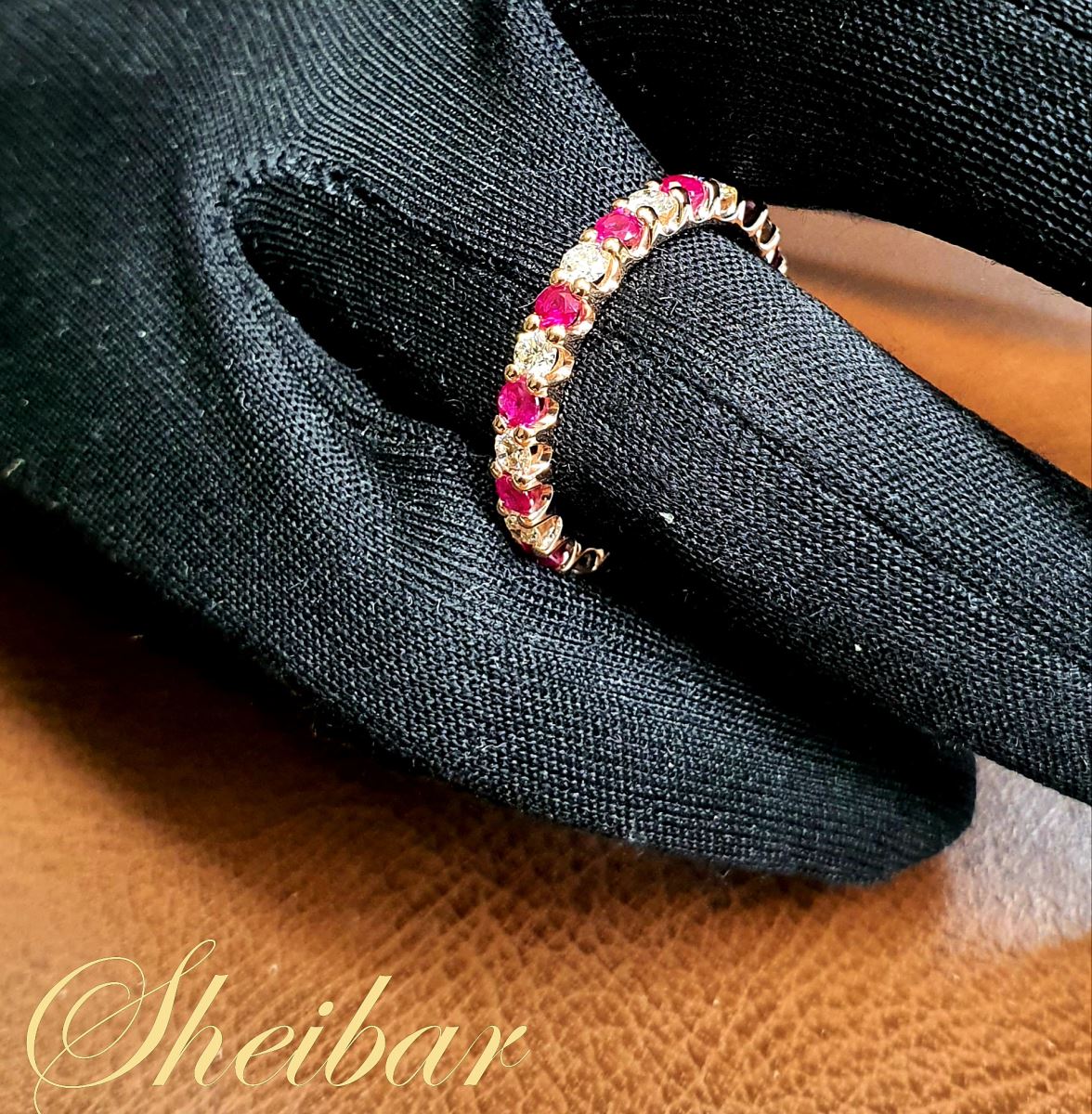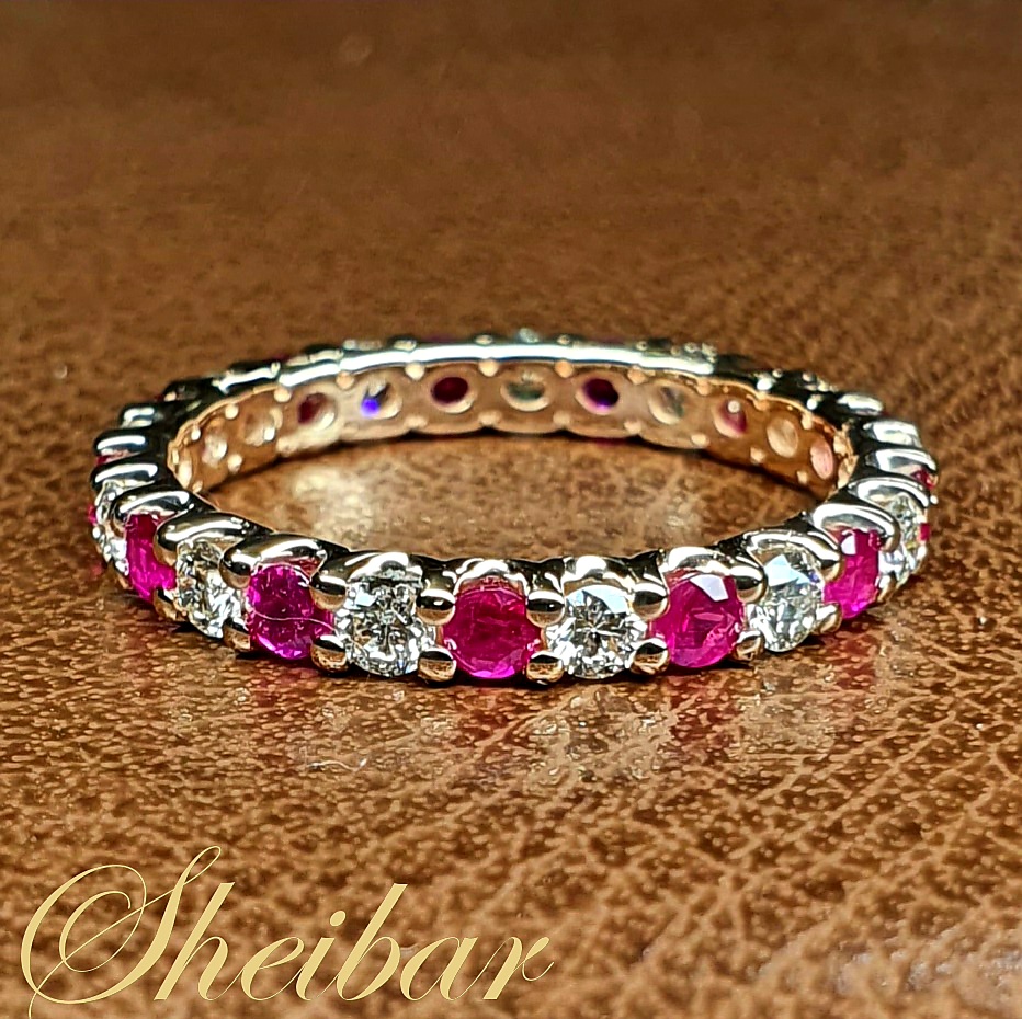 טבעת יהלומים "גלגל איטרניטי’ , טבעת בשיבוץ מלא המשלב יהלומים ואבני רובי טבעיים. טבעת מרשימה ויוקרתית זו דורשת עבודת דייקנות ברמה הגבוהה ביותר. לכן מודל הטבעת נעשה בעבודת לייזר ברמה גבוהה על מנת לשמור על רמת עבודה ואיכות מהגבוהות שיש. הלייזר נעשה אחד אחד על גבי כל אחד מהשיניים של היהלומים ובכך יוצר גלגל שיניים נוצץ ומרשים מזהב חלק ומבריק. על גבי הטבעת משובצים יהלומים גדולים ומרשימים המשולבים עם אבני חן (רובי) שרואים כל אחד בפני עצמו. עבודת השיבוץ נעשתה אחד אחד, יהלום יהלום ובכך יוצר מצב של גלגל יהלומים ואבני חן נוצצים ומרשימים. תכשיט ברמת גימור גבוהה ביותר. בהחלט תכשיט מרשים ביופיו...!
