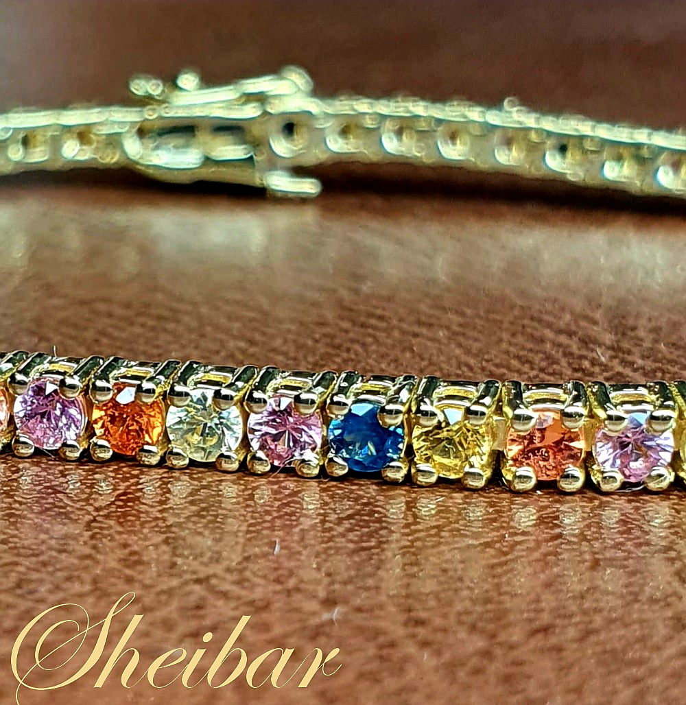 צמיד טניס משובץ ספירים צבעוניים טבעיים בעיצוב קלאסי ואיכותי. צמיד טניס זה משובץ בשיבוץ שיניים המיוחד. מה שיפה בתכשיט ושיבוץ זה הוא "החשיפה" והנוכחות שיש לאבני חן בשיבוץ השיניים. יש אפשרות לכניסה ויציאה של אור דרך האבנים ובכך מביא לנצנוץ מרבי לתכשיט. צמיד טניס קלסי גמיש ונוח לענידה.