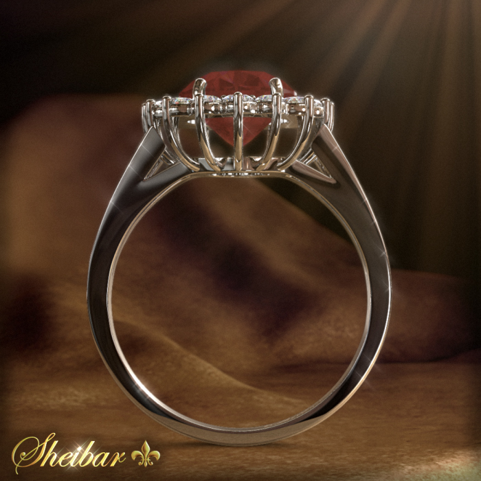 טבעות רובי ויהלומים, כשמה כן היא טבעת הנסיכה דיאנה . טבעת נסיכתית בעיצוב משודרג ומדהים, בעבודה איכותית ויוקרתית. תחילה ניתן לראות את העבודה מבסיס הטבעת כאשר מתחילה בשורה אחת של זהב חלק ובחלקה העליון מתפצלת ל-2 פסי זהב חלקים ויפים. הזהב הוא זהב 14K חלק ונקי ביותר. בחלקה העליון של הטבעת ניתן לראות את הראש המדהים, בעל הנוכחות הרבה שהוא מפגין. במרכז התכשיט נמצאת אבן חן "רובי" אדומה מדהימה וצלולה בליטוש ’OVAL’. מסביב לאבן זו משובצים יהלומים לבנים וגדולים יחסית אשר נותנים אפקט נוסף לתכשיט ויוצרים עבודה יוקרתית ואיכותית לתכשיט. ללא ספק תכשיט בעיצוב מרשים ביותר..!
