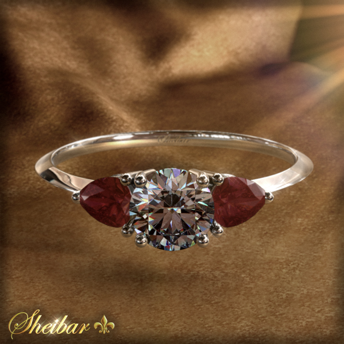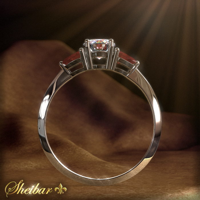 טבעת רובי ויהלומים, מודל "טרילון רובי", טבעת מעניין וקלסי. הדבר הראשון והמיוחד בטבעת זו שיישר שמים לב הוא צורת 2 אבני החן משני צידי היהלום. אבני חן אלו לוטשו בצורת PEAR (טיפה) המשובצים לרוחב הטבעת (ניתן לשבץ את כל סוגי אבני החן לפי הזמנה). הטבעת עצמה נעשתה בעבודת צורפות מיוחדת ועדינה ובכך שומרת על צורתה הייחודית. במרכז הטבעת יישנו את היהלום המרכזי הגדול והיפה שנמצא בין אבני החן ובכך מובלט בצורה יוצאת דופן. כלל האבנים משובצים על גבי זהב שנעשה בעבודה חלקה וצרה בכדי להפיק את צומת הלב לאבנים במרכז.