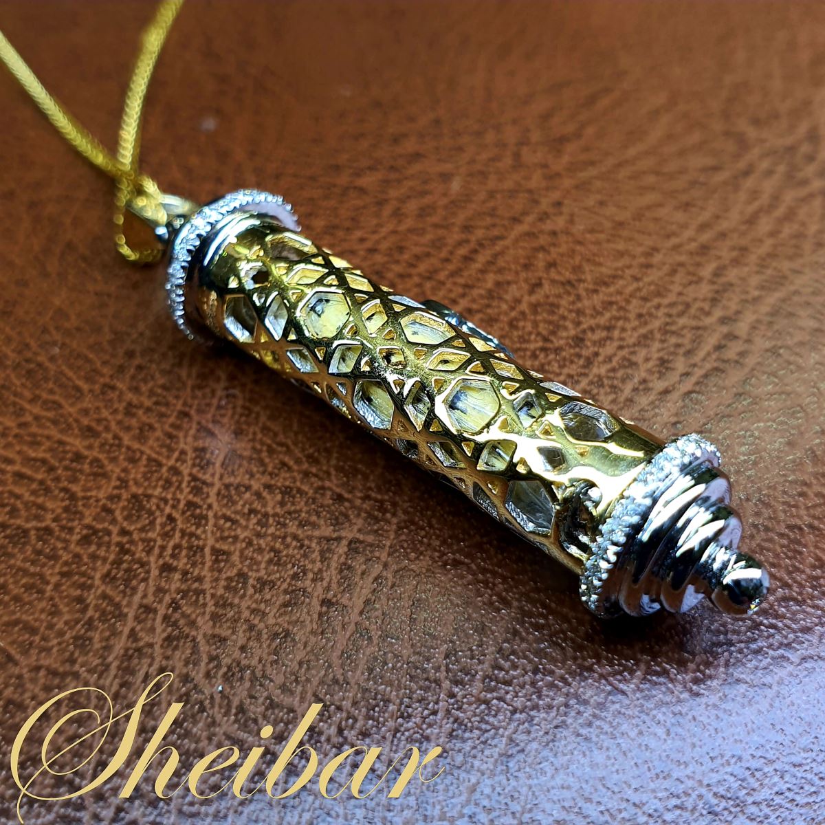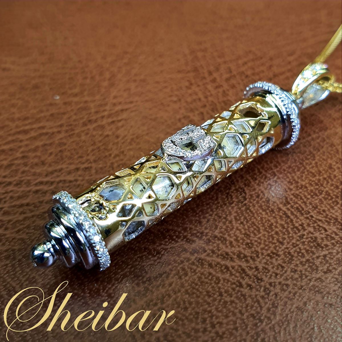 שרשראות יהלומים, שרשרת "מזוזה" לגבר. תליון מיוחד במינו, בעל עבודה מיוחדת. התליון עצמו מורכב מ-3 חלקים נפרדים, שבסופו של דבר מתחברים לתליון אחד מרשים. תחילה ניתן לראות את מרכז התליון שעשוי זהב חלק ומבריק, כאשר כל כולו במרכז עשוי ממגני דוד קטנים ויפים וכך נוצרת מן "רשת" של זהב ממגני דוד. 2 החלקים הנוספים הם למעשה החלקים שסוגרים את מרכז התליון מלמעלה ומלמטה, שניהם נסגרים עם הברגה ולחץ על התליון. בנוסף, ישנם היהלומים הלבנים והנוצצים המוסיפים עוד יופי ויוקרתיות לתכשיט. התליון משובץ גם באות "ש" שבמרכז התליון והן גם בשני הסוגרים למטה ולמעלה וגם במתלה המחבר בין התליון לשרשרת. בתוך התליון מזוזה מגיע גם קלף ממוחשב המגולגל בפנים. בהחלט תליון מרשים ומיוחד במינו...