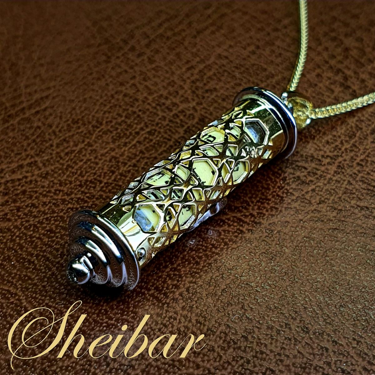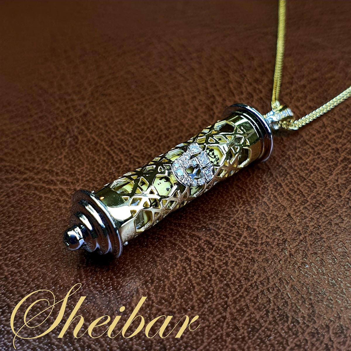 שרשרת "מיני מזוזה" עשויה כולה זהב 14K לבן וצהוב משולב. שרשרת זו מיוצרת בעבודת יד ובנויה מ-5 חלקים בעבודה עוצרת נשימה. גליל המזוזה עשוי זהב צהוב וכולו עטוף בטקסטורת מגני דוד מיוחדת במינה. על גבי גליל זה האות "ש" מעוטרת ביהלומים איכותיים ביותר באיכות VVS/F בנוסף, מתלה התליון משובץ גם הוא 5 יהלומים איכותיים באותה רמה. חלקה התחתון של המזוזה נשלף ובתוכו קלף של שיר למעלות (קלף ממוחשב עטוף פעמיים לפי התייעצות רב). לכל היופי הזה , מתווספת שרשרת עדינה ושזורה מזהב. **ניתן להוסיף ברכה או קמע אישי לקלף.