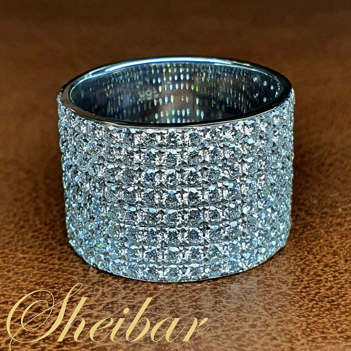 טבעת יהלומים פווה- טבעת ג’ולי. טבעת רחבה ומרשימה שמשובצת על גבי 2/3 מהטבעת ביהלומים גדולים מהסטנדרט ומאוד מרשימים. כל היהלומים משובצים בשורות ישרות וצמודות אחת לשנייה, ובכך מביאות לנצנוץ המרשים שניתן לראות בטבעת. הטבעת עשויה זהב 18K איכותי. היהלומים שמשובצים באיכות גבוהה מאוד של VS/F. טבעת שנעשתה בעבודה מיוחדת ואיכותית (אחת במלאי). טבעת שנותנת נוכחות רבה והמון יוקרה.