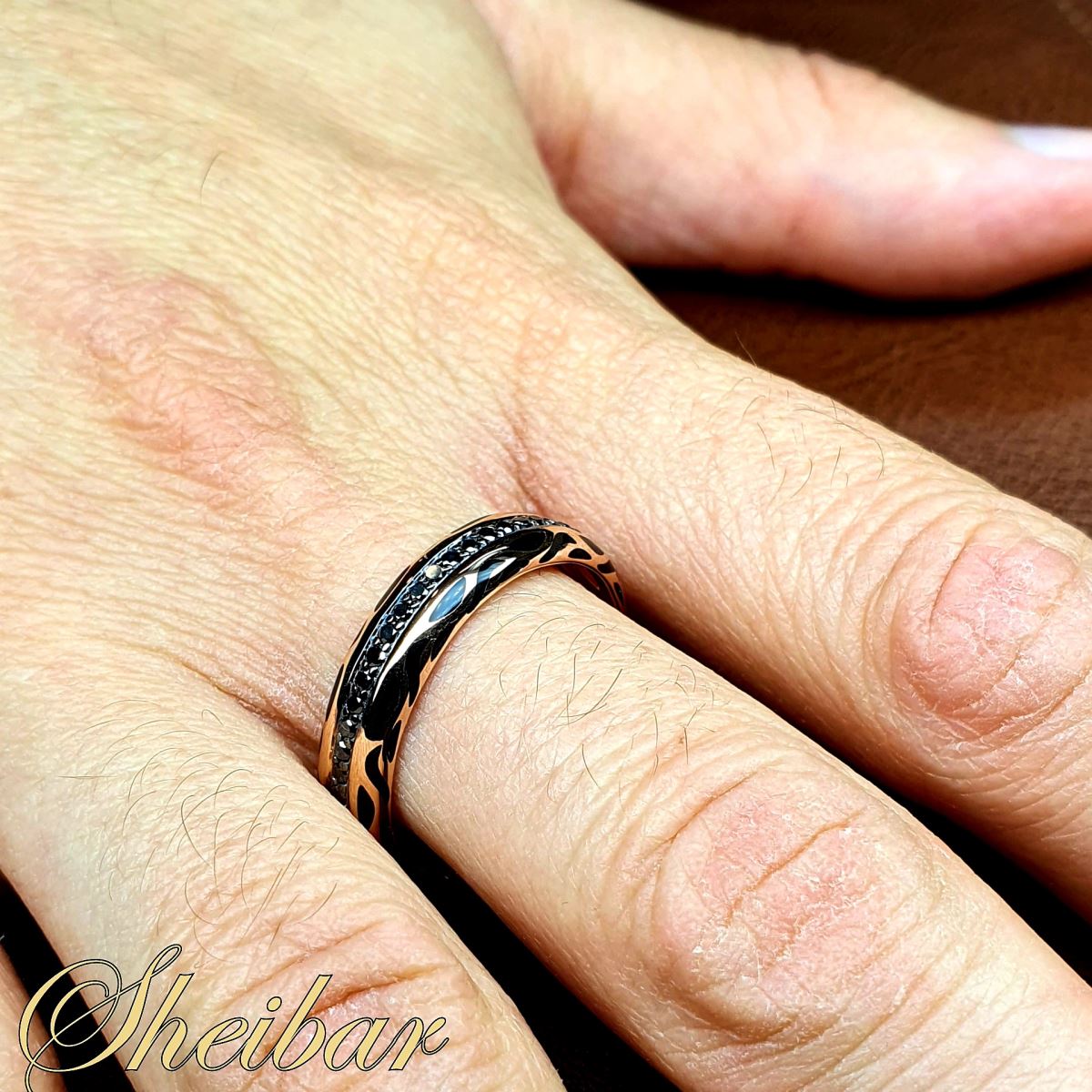טבעת מעגל יהלומים אמייל. טבעת בעיצוב מיוחד עם שילוב של חומר "אמייל" המיוחד. טבעת שמשובצת לכל אורכה יהלומים, ומשני הצדדים שילוב מעוצב של אמייל. בחלק הפנימי של הטבעת נעשתה עבודה מיוחדת שנקראת "ביזה", וזאת כדי לשמור על נוחות בענידת הטבעת. הטבעת עשויה זהב אדום 14K איכותי. טבעת מיוחדת ומרשימה. משובצת יהלומים שחורים לכל אורך הטבעת.